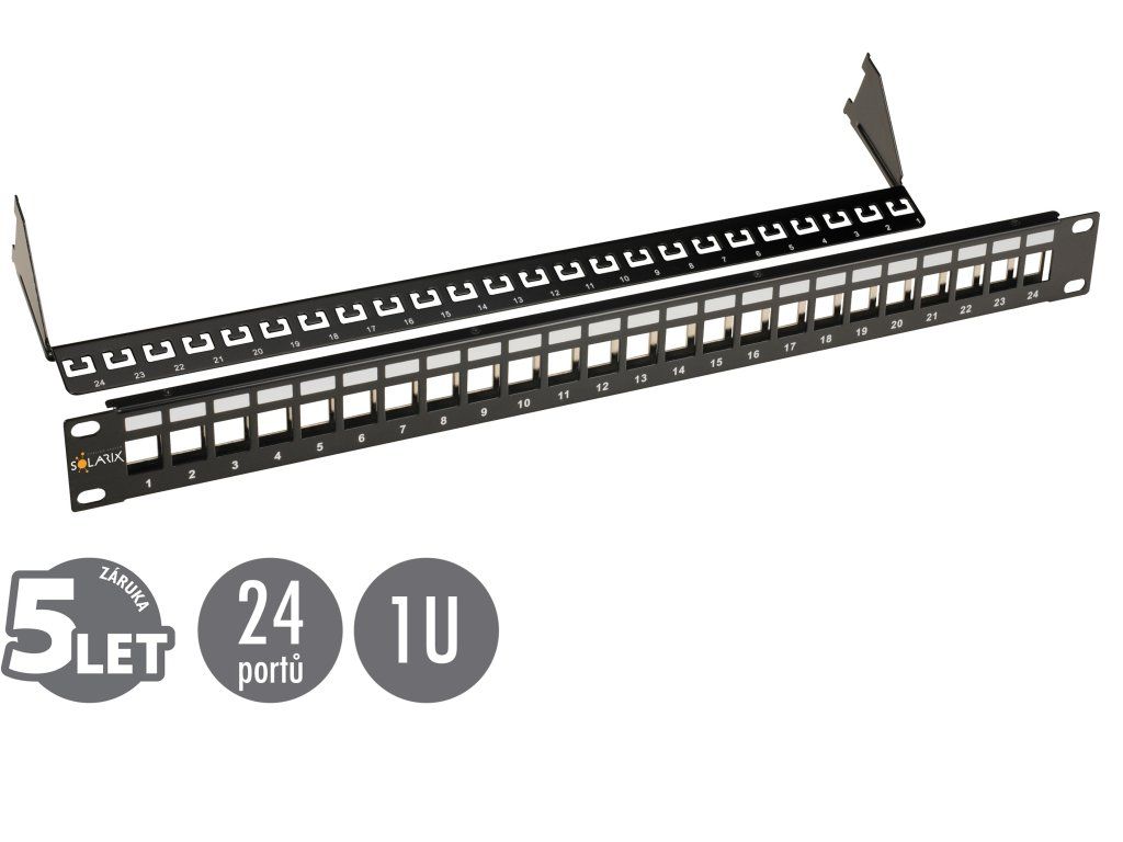 Patch panel Solarix s označením SX24M-0-STP-BK-UNI je univerzální neosazený patch panel, který je určený pro 24 stíněných i nestíněných keystonů Solarix SXKJ-xx-yyy-BK-SA a SXKJ-xx-yyy-BK-NA. Modulární provedení patch panelu umožňuje pohodlnou instalaci a díky vyvazovací liště, která je součástí dodávky panelu, i přehledné vyvázání a pevné uchycení datového kabelu přímo k tělu panelu. Tento patch panel je vybaven zemnícím drátem, který umožňuje jeho propojení se zemněním rozvaděče. Barva patch panelu i vyvazovací lišty je černá, velikost v datovém rozvaděči je 1U. V případě potřeby je možné zaslepit volné porty panelu záslepkou SXKJ-0-BK. Rozměry otvorů pro keystone jsou u tohoto modulárního panelu Solarix 19,5±0,1 mm x 14,8±0,1mm (tj. dle ČSN EN 60603-7). Součástí balení je 4x M6 montážní sada, 24x vyvazovací pásek a 1x zemnící drát. Panel je celokovový.