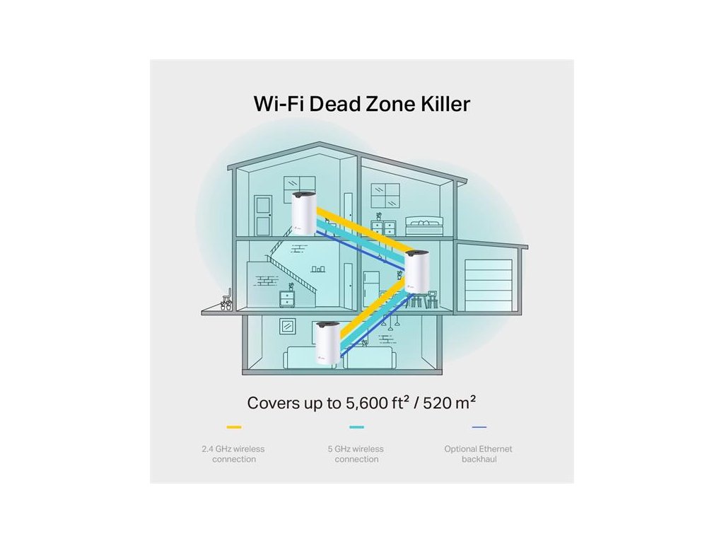 Optional Ethernet backhaul works together to link Deco units to provide seamless coverage