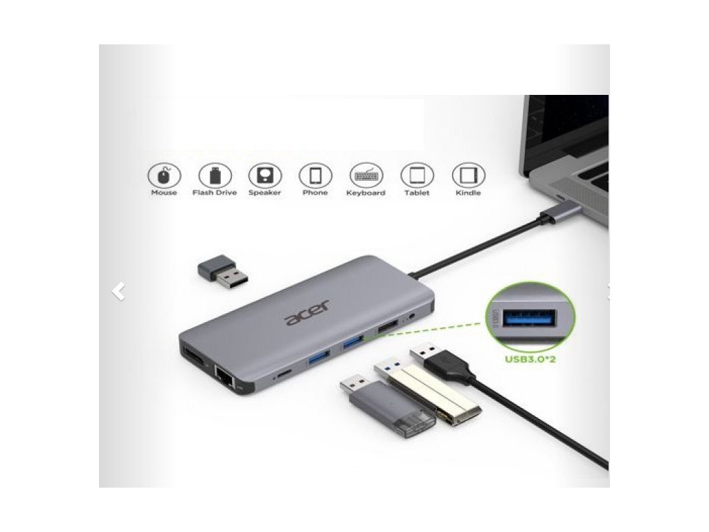 originální název: ACER 12IN1 TYPE C DONGLE: 2 x USB3.2, 2 x USB2.0, 1x SD/TF, 2 x HDMI, 1 x PD, 1 x DP, 1 x RJ45, 1 x 3.5 Audio