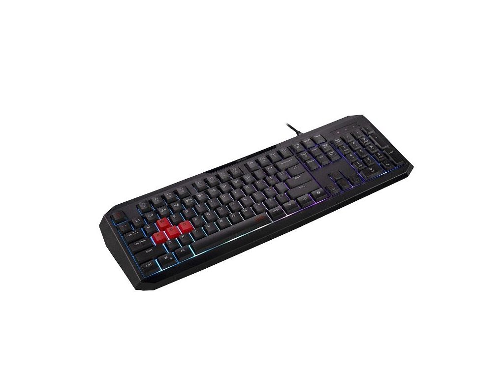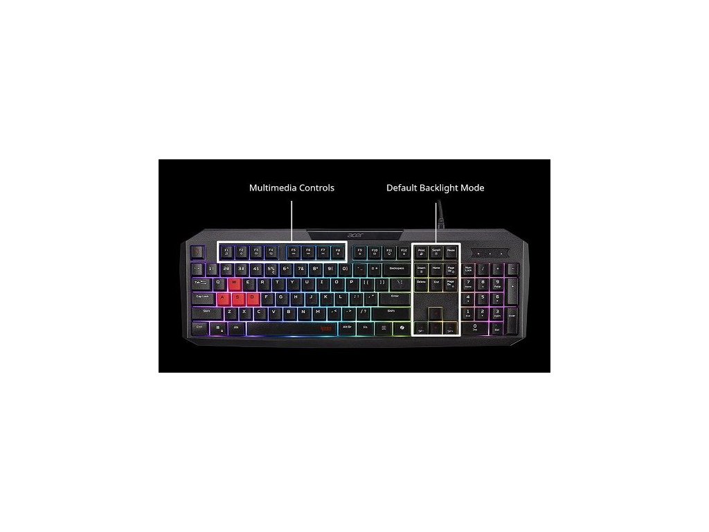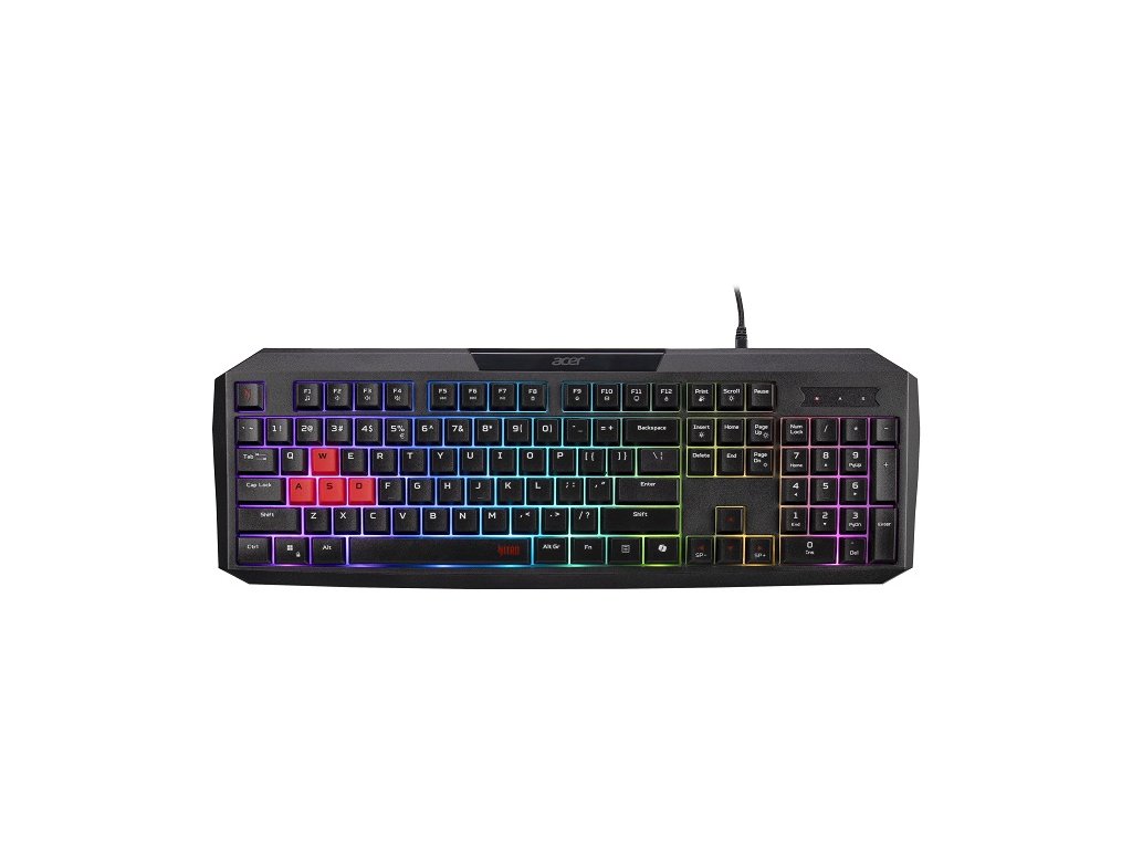 Acer Nitro Gaming Keyboard 100, Membrane Switch, 26 Anti-ghosting kláves, životnost 3 mil. stisků, 7 zón RGB podsvícení, 11 světelných módů, červené klávesy WASD, Copilot key, konektor USB-A s kabelem 1,8 m, CZ/SK layout, hmotnost 710 ± 10g, rozměry 440 x 170 x 37 mm, černá (Retail Pack)