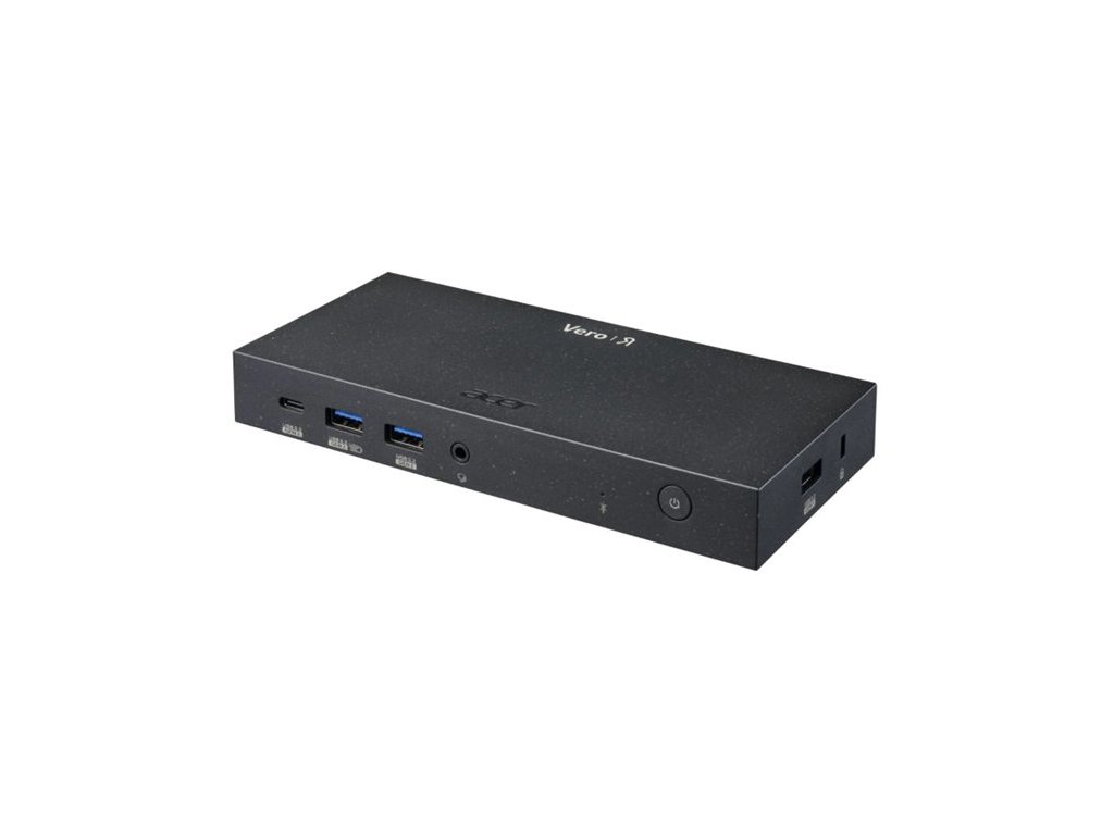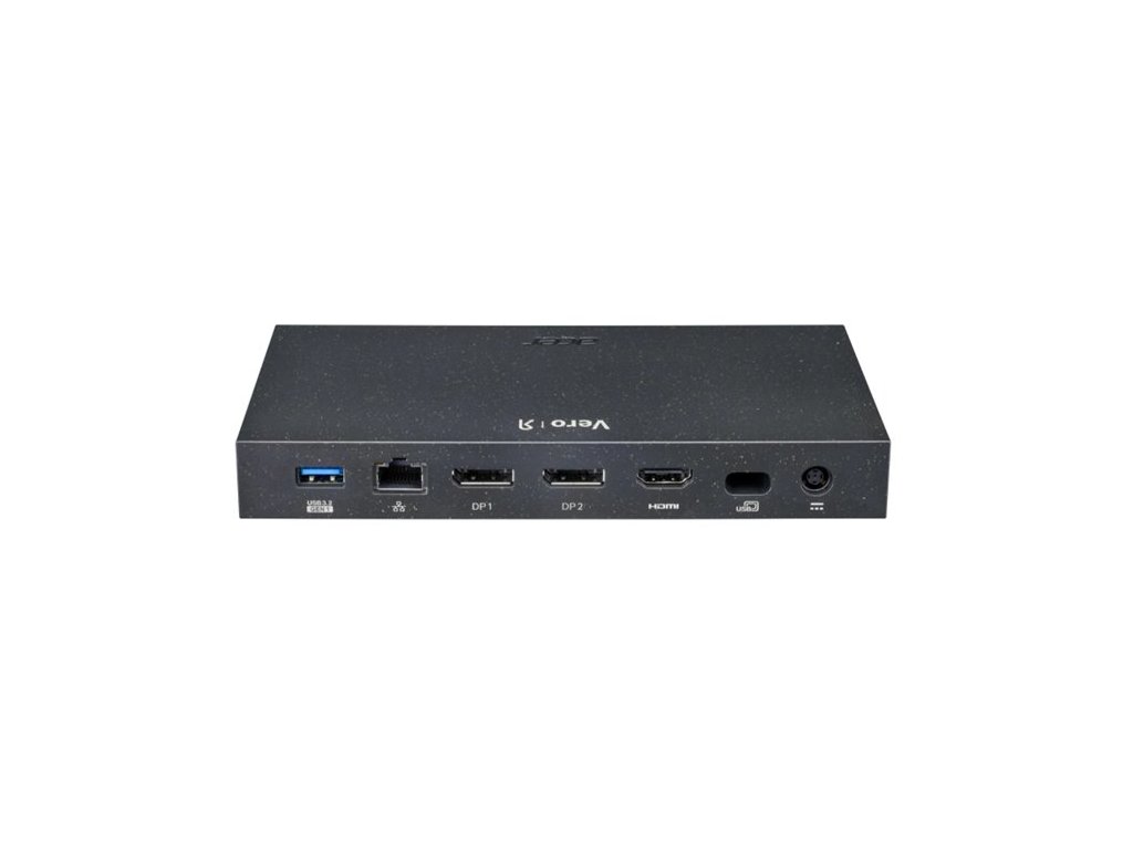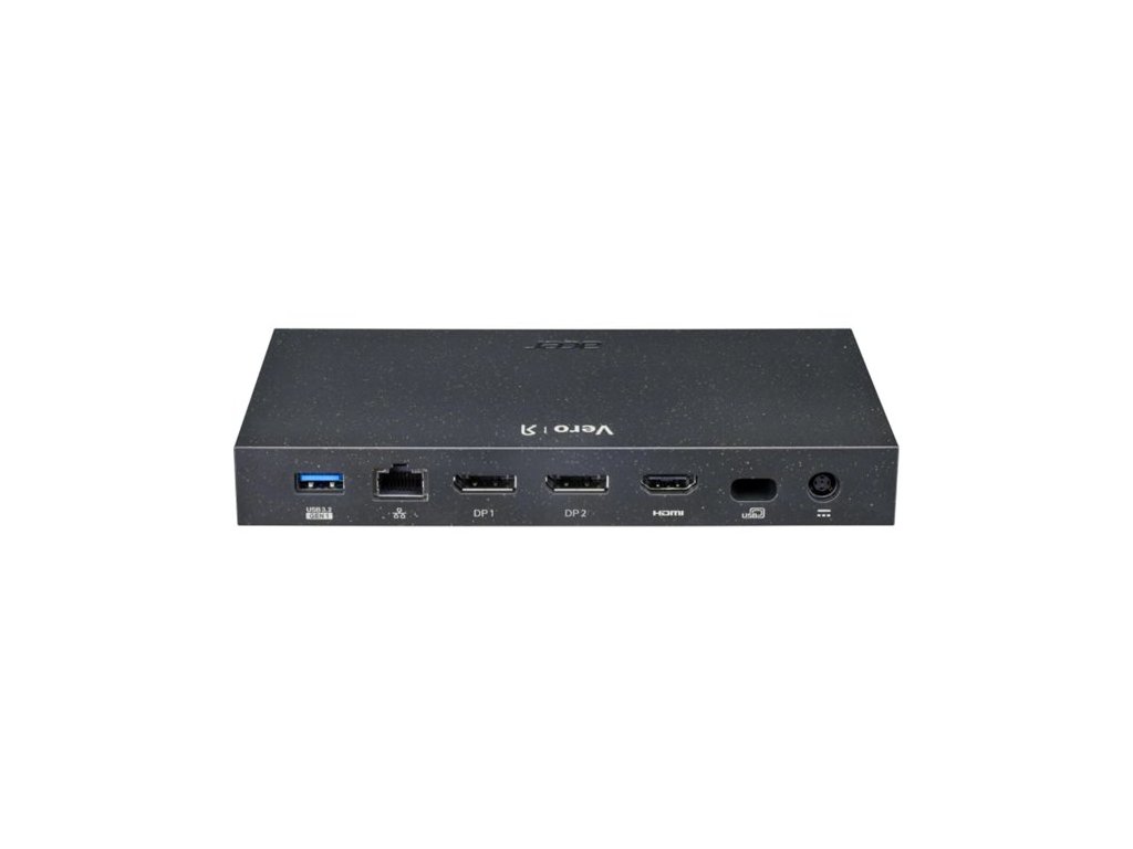 Acer Vero MST Dock M33 100W PD - 1x USB-C Host (100W Power Delivery); 1x USB-C 3.2 Gen2 10 Gb/s; 1x USB-A 3.2 Gen2 10Gb/s; 1x USB-A 3.2 Gen2 10Gb/s (BC 1.2); 2x USB-A USB 3.2 Gen1 5 Gb/s; 1x HDMI 2.0b; 2x Display port 1.4; 1x RJ45 1 GB/s; 1x 3.5 mm Combo Audio jack; Kensington lock; MAPT, PXE, WOL (MS, S3, S4, S5), Power button and LED Mirror (require NB BIOS/SW support); 135W AC Adapter EU plug; 180 x 82 x 25 mm; 232 g; Black (PCR); (Retail pack)