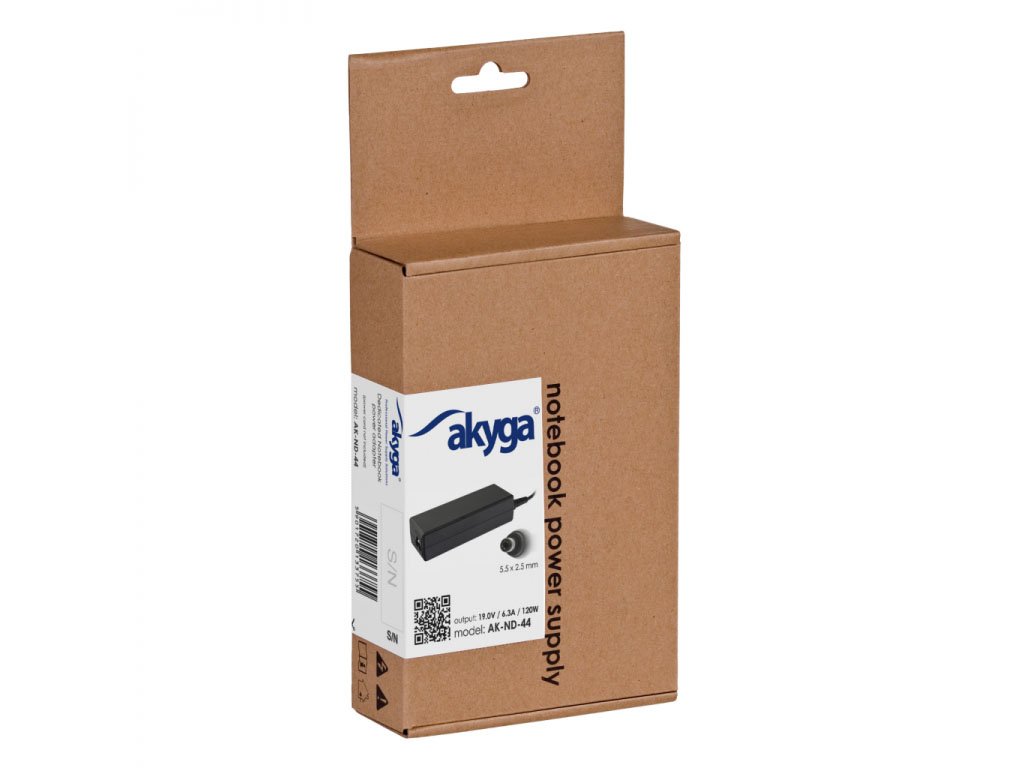 Akyga AK-ND-44 je spolehlivý 120W napájecí adaptér s výstupním napětím 19 V a proudem až 6,3 A, vybavený konektorem 5,5 × 2,5 mm, ideálním jako náhradní nebo univerzální zdroj pro notebooky kompatibilní s uvedenými parametry, zejména pro modely značek Fujitsu-Siemens, HP / Compaq a Toshiba. Napájecí kabel je opatřen feritovým filtrem pro omezení elektromagnetického rušení a adaptér disponuje kompletní sadou ochran proti přepětí, přetížení, zkratu i přehřátí, které zajišťují bezpečný a stabilní provoz připojeného zařízení. Díky technologii soft start je navíc minimalizován nárazový proud při zapnutí. Napáječ podporuje široký vstup 100–250 V AC a je dodáván v ekologickém balení EcoBox.