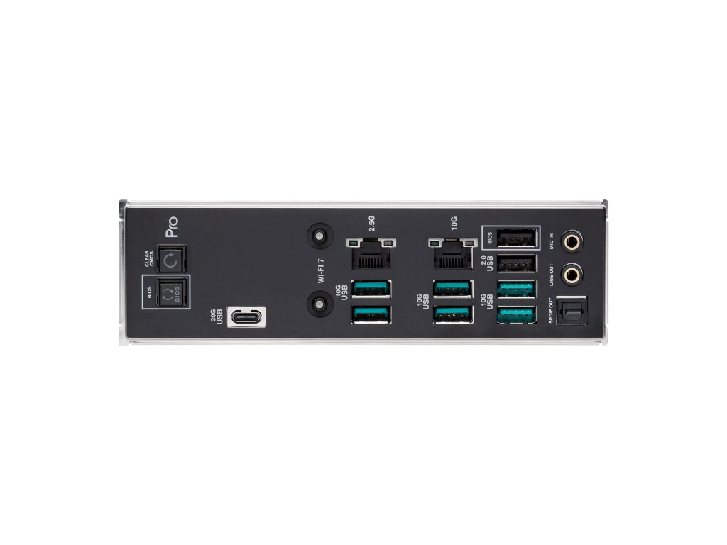 2 x porty USB4® (40Gb/s) (2 x USB Type-C®) 6 x porty USB 10Gb/s (6 x Type-A) 1 x port USB 2.0 (2 x Type-A) 1 x Wi-Fi modul 1 x port Marvell® AQtion 10Gb Ethernet 1 x port Intel® 2,5Gb Ethernet 2 x audio konektory 1 x tlačítko BIOS FlashBack™ 1 x tlačítko Clear CMOS.