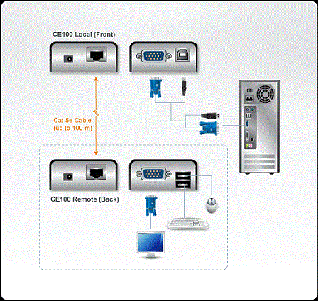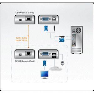 CE100 USB KVM Extender s vynikající kvalitou obrazu a zabudovanou ochranou ESD umožňuje přístup k počítačovému systému ze vzdálené konzoly USB (klávesnice USB, myš USB a monitor).