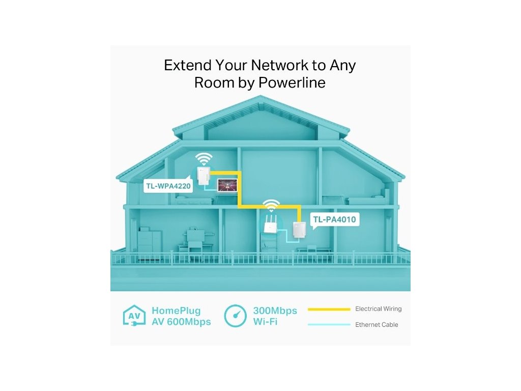 AV600 Powerline N300 Wi-Fi Kit KIT: 1× TL-WPA4220 + 1× TL-PA4010 TL-WPA4220: SPEED: 300 Mbps at 2.4 GHz, 600 Mbps Powerl