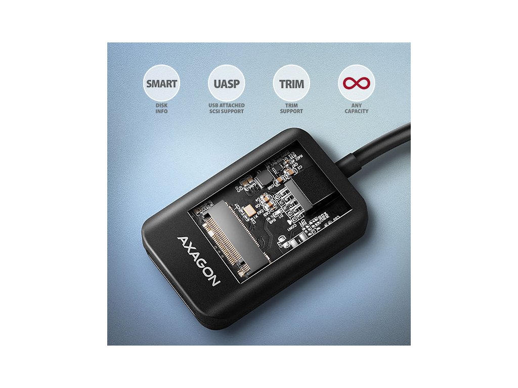 • Podpora přenosových rychlostí 10.000 / 5.000 / 480 Mbit/s. • Podpora M key nebo B+M key NVMe (PCI-Express) i SATA (AHCI) M.2 SSD disků bez omezení maximální kapacity. • Podpora M.2 disků rozměrů - bez omezení délky. • Podpora jednostranných i oboustranných M.2 SSD disků. • Vyhovuje PCI Express Base Specification Revision 3.1a specifikaci. • Vyhovuje NVM Express 1.3 specifikaci. • Vyhovuje Serial ATA 3.2 specifikaci (SATA/600), přenosové rychlosti až 6 Gb/s (600 MB/s). • Vyhovuje USB Mass Storage Class specifikaci. • Celková propustnost / přenosová rychlost adaptéru je dána použitým USB rozhraním (teoreticky až 10 Gbit/s). • Reálná propustnost / přenosová rychlost adaptéru kolem 1000 MB/s (1 GB/s) je dána limity USB 3.2 Gen 2 rozhraní. • Podpora BOT (Bulk-Only Transport). • Podpora UASP (USB Attached SCSI) pro rychlejší přenos dat ve Windows 8 a novějších. • Podpora funkce TRIM pro omezení pozvolné degradace výkonu SSD v čase. • Podpora S.M.A.R.T. (Self-Monitoring, Analysis, and Reporting Technology) systém monitorující stav disku. • Podpora bootování z SSD v externím boxu. • Možnost připojení zařízení za chodu díky podpoře Hot Plug. • Plná podpora Plug and Play. • Napájení po USB sběrnici až 900mA z jednoho USB portu zcela dostačuje ve všech případech. • Decentní modrá LED dioda indikující připojení k USB portu počítače (trvalým svitem) a přenos dat (blikáním).