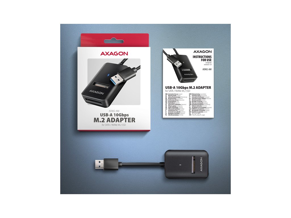 • M.2 adaptér s kabelem napevno délky 10 cm, • vícejazyčný návod CZ/DE/DK/ENG/ESP/EST/FIN/FR/GR/HR/HU/IT/LT/LV/NL/NOR/PL/PT/RO/SK/SLO/SRB/SWE/TR/UA/ALB/BG/BOS/CN/ARA, • baleno v kartonové krabičce s otvorem pro zavěšení.