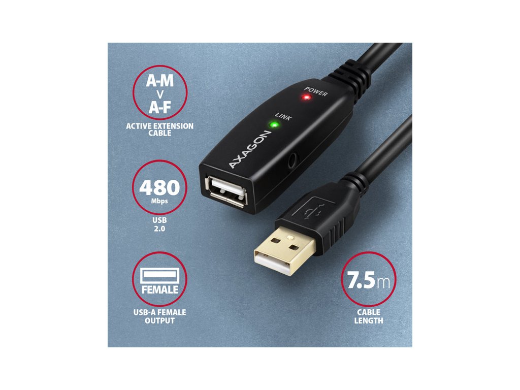 AXAGON ADR-207, USB 2.0 A-M -> A-F aktivní prodlužovací / repeater kabel, 7.5m