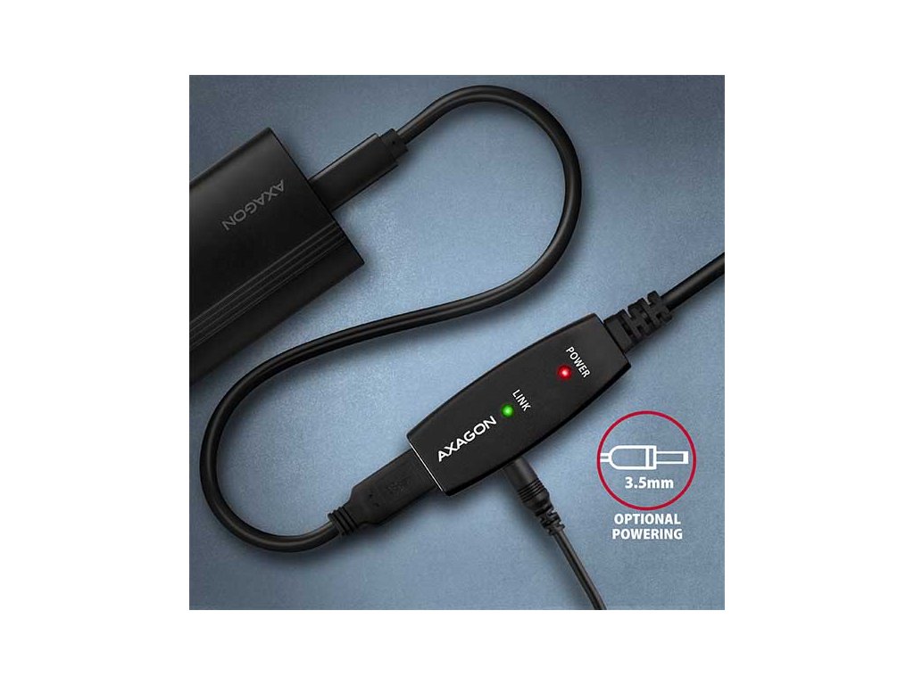 • Napájení kabelu i připojených zařízení po USB sběrnici (bus-power mód 5V - 500mA). • Pro většinu připojených USB zařízení je napájení po USB sběrnici dostatečné a není potřeba žádné přídavné napájení. • Aktivní část kabelu obsahuje konektor (3.5 x 1.3mm vnější x vnitřní průměr) pro přídavné externí napájení 5V/1-2A. • Napájecí kabel USB A-M / 3.5mm jack délky 1.2 m je součástí balení. Kabel umožní napájení z běžné nabíječky mobilních telefonů s USB-A výstupem 5V / min. 1A, např. AXAGON ACU-QC18. • Při napájení repeater kabelu napájecím adaptérem lze připojit i externí 2.5'' disk bez potřeby vlastního napájení disku. • U delší USB trasy s několika repeater kabely zapojenými za sebou může být již napájení po USB sběrnici nedostatečné i pro USB zařízení s nižším odběrem než externí 2.5'' disk. Také v tomto případě může pomoci posílení napájení připojením napájecího adaptéru.