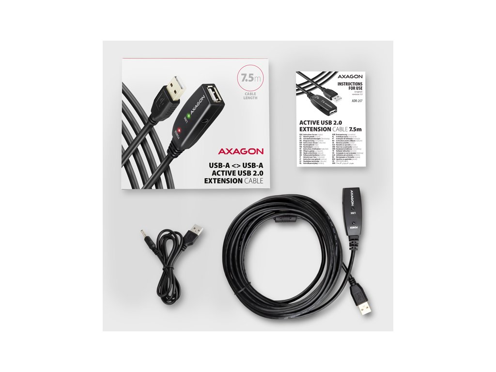 • USB 2.0 A-M > A-F aktivní kabel délky 7.5 m, • USB-A / 3.5 mm napájecí kabel, • vícejazyčný návod CZ/DE/DK/ENG/ESP/EST/FIN/FR/GR/HR/HU/IT/LT/LV/NL/NOR/PL/PT/RO/SK/SLO/SRB/SWE/TR/UA/ALB/BG/BOS/CN/ARA.