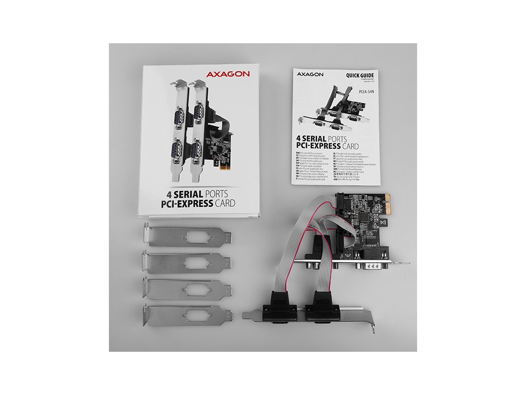 • PCI-Express kartu se standardní záslepkou, • standardní záslepku se sériovými porty, • low profile záslepky, • multijazyčný manuál CZ/DE/DK/ENG/ESP/FIN/FR/GR/HR/HU/IT/NL/PL/PT/RO/RU/SK/SWE/TR/BG/CN/ARA.