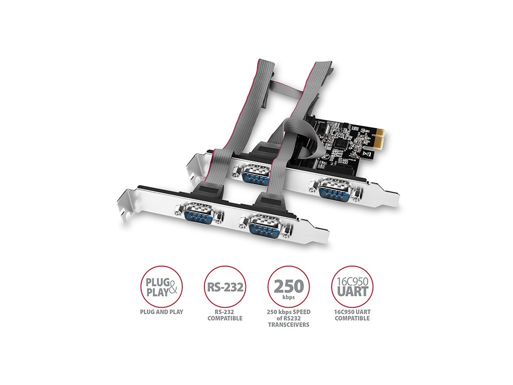 • 4x sériový RS-232 port s DB9 male konektory, porty umístěny na kartě + na samostatné záslepce a propojeny s kartou kabelem. • Garantovaný datový tok použitých RS232 budičů až 250 kBd. • Kompatibilní s 16C550 / Extended 16C550 / 16C950 UART.
