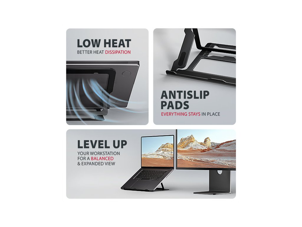 • Lehká a pevná kovová konstrukce. • Protiskluzová úprava, která zároveň chrání zařízení od poškrábání. • Vhodný pro 10''–17.3'' notebooky nebo jiná zařízení. • Osm nastavitelných pozic. • Nastavitelná výška 91–150 mm. • Nosnost dimenzována pro všechny typy notebooků: max. 20 kg. • Skladný a lehce složitelný. • Držák notebooku umožňuje lepší odvod tepla. • Rozměry: 220 × 230 × 15 mm (Š × H × V). • Hmotnost: 312 g.