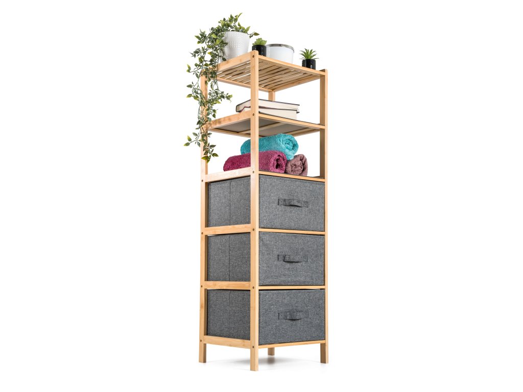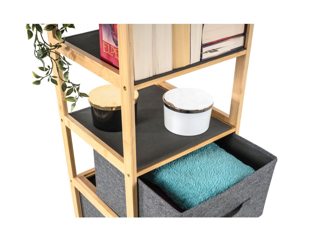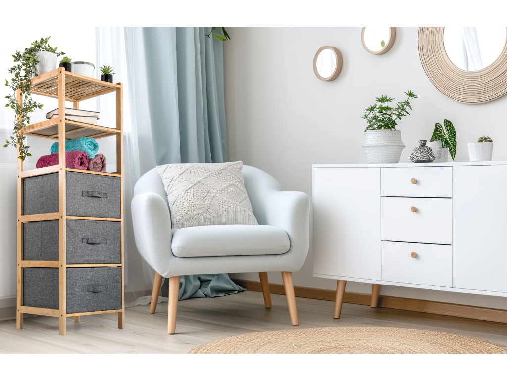 Bambusový regál s výsuvnými látkovými zásuvkami dodává interiéru příjemný přírodní dojem, pocit lehkosti a přirozenosti, zatímco jeho pevnost a dlouhá životnost zajišťují stabilitu a trvanlivost.