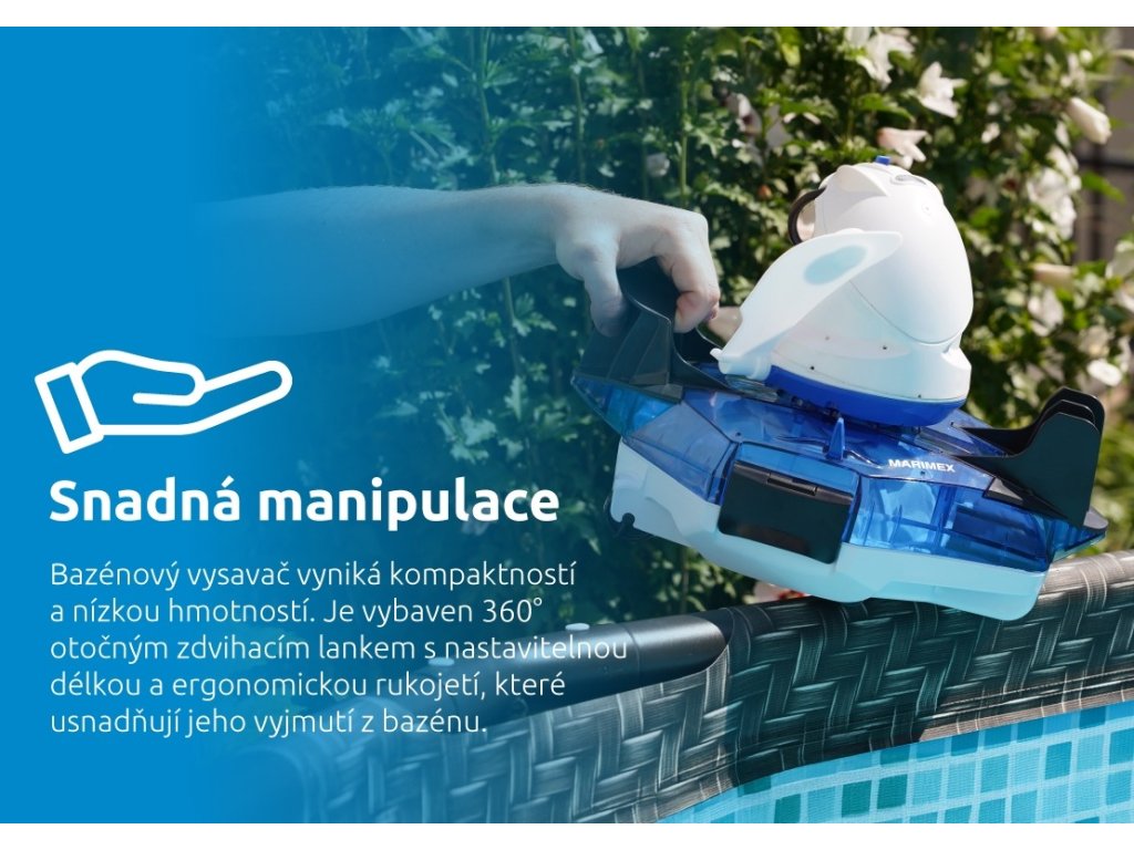 Vysavač je vybavený automatickým senzorem vody, který sepne motor pouze po ponoření do vody. Tím zajišťuje úsporu energií a zároveň prodlužuje životnost spotřebiče. Díky kompaktním rozměrům je manipulace s vysavačem opravdu pohodlná. Z bazénu ho vyndáte pomocí ergonomické rukojeti a o 360° otočného zdvihacího lanka s nastavitelnou délkou.