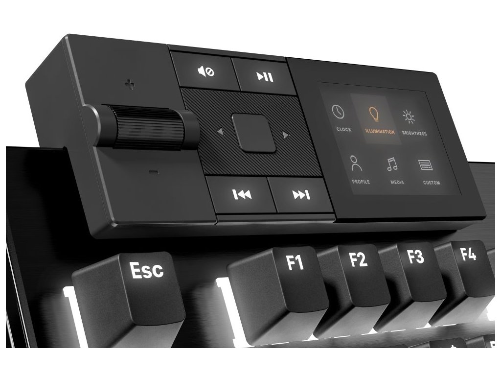 8 programovatelných kláves s displejem umožňuje zobrazení vlastních obrázků nebo animací. ARGB podsvícení s difuzéry na každém spínači zajišťuje rovnoměrné osvětlení jednotlivých kláves s možností nastavení atmosférických efektů.