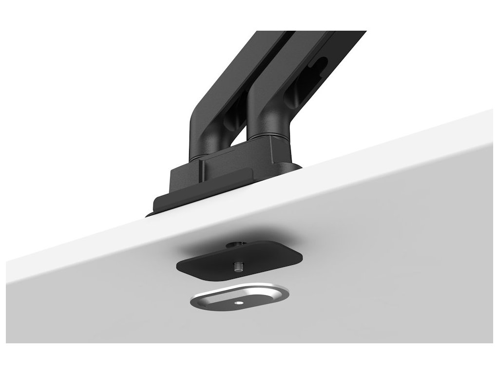 Konstrukce využívá optimalizovanou nakloněnou strukturu s plynovými pružinami testovanými na 25 000 cyklů, což zajišťuje spolehlivou podporu a zabraňuje prověšení monitorů během dlouhodobého používání. Součástí balení jsou ocelové výztužné desky pro ochranu tenkých, skleněných a jiných křehkých stolních desek.