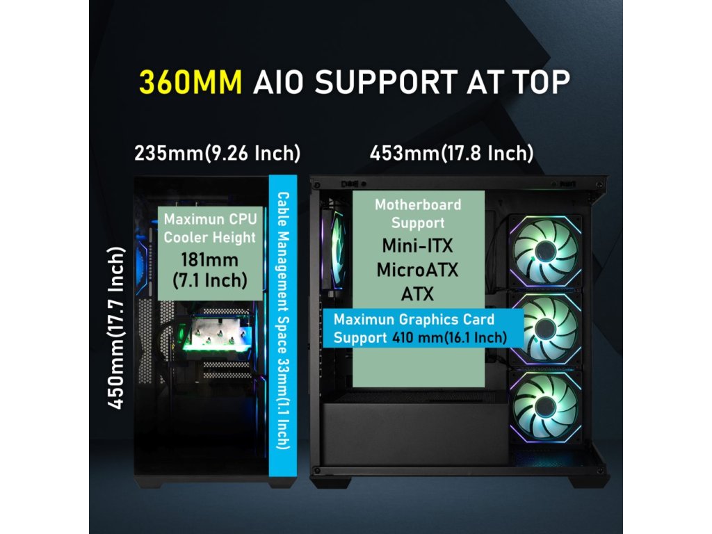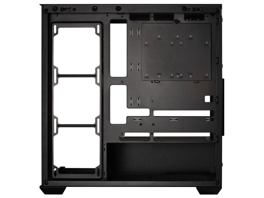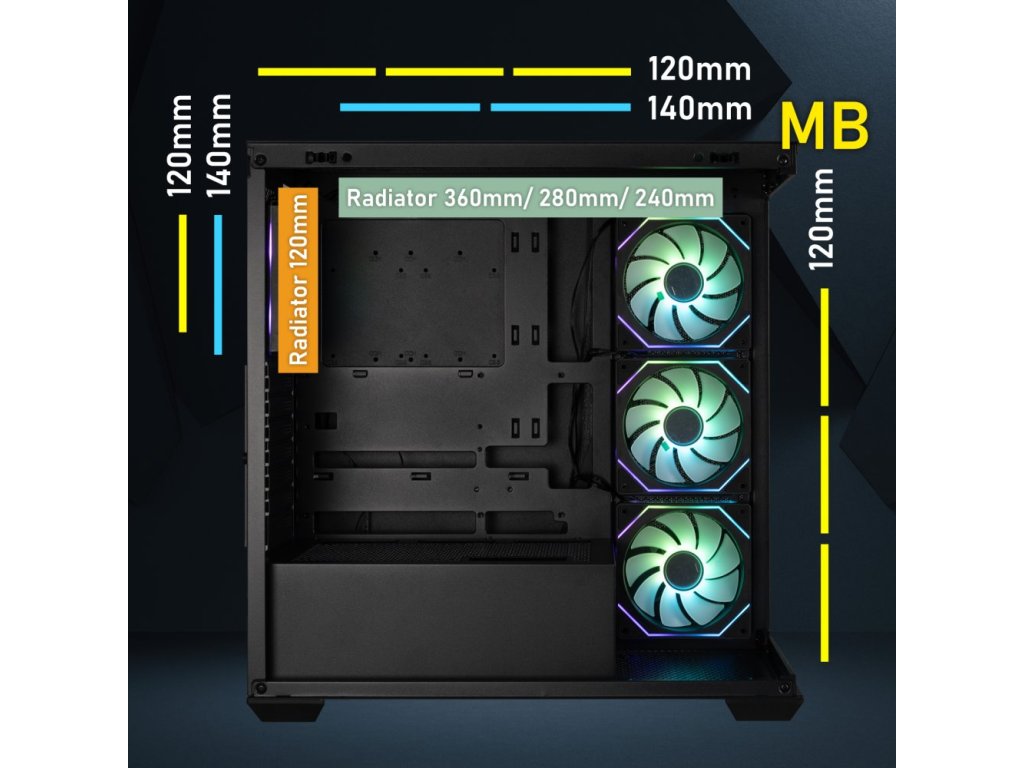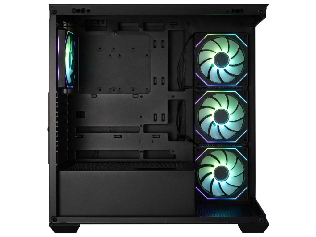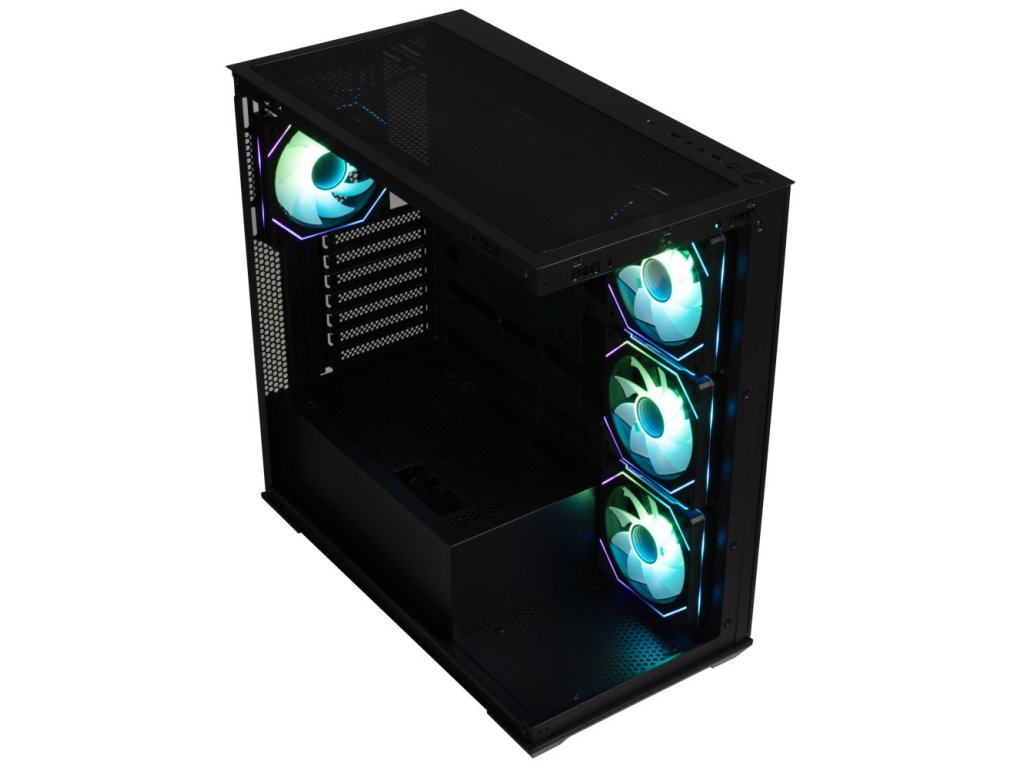 Herní počítačová skříň nabízí stylovou prosklenou bočnici i přední panel a prvotřídní kovovou konstrukci. Skříň je osazena čtyřmi ventilátory o velikosti 120 mm s ARGB podsvícením a efektem nekonečného zrcadlení. Potěší také možnost rozšíření o další 3 ventilátory. Samozřejmostí jsou také prachové filtry. Důmyslné řešení umožňuje pohodlné umístění až 360 mm dlouhého výměníku vodního chlazení na horní straně. Ve skříni je dostatek prostoru pro chladič CPU do výšky až 181 mm a grafickou kartu o délce až 410 mm. Na horním panelu se nachází dva porty USB 3.0, jeden port USB-C, sluchátkový výstup a vstup pro mikrofon. Skříň je dodávána bez zdroje.