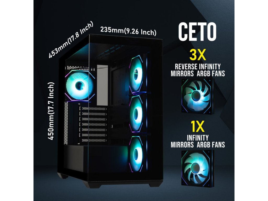Stylový skříň BitFenix CETO Cube, se kterou váš PC systém povstane k novým hranicím výkonu. Disponuje průhlednou bočnicí i předním panelem, díky čemuž vám poskytne panoramatický pohled na běhající hardware. Užijte si naplno pohled na našlapané komponenty. Součástí skříně jsou 4 předinstalované 120mm ventilátory, které kromě potřebného chlazení podporují také ARGB podsvícení a efekt nekonečného zrcadlení.
