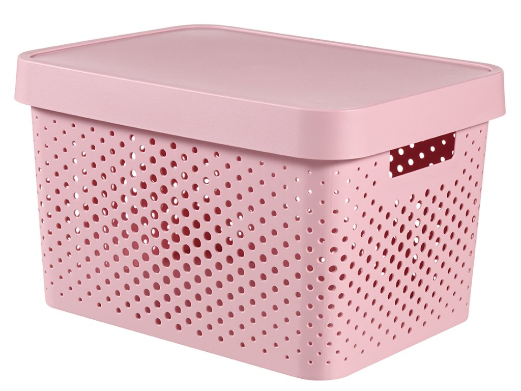 Růžový box Infinity Dots značky Curver je vyrobený ze 100% recyklovaného plastu. Přepravka o objemu 17 litrů má praktické víko, takže udrží vše perfektně uvnitř. Pokud si pořídíte více těchto boxů, můžete je stohovat na sebe.