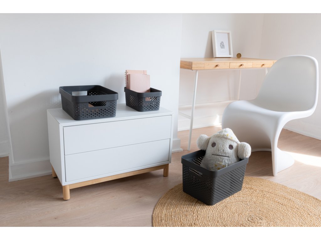 Tento stylový a praktický box se vyrábí ze 100% recyklovaného plastu. Je tedy šetrnější k životnímu prostředí. Box má všechny stěny perforované malými dírkami. Je tedy ideální pro všechny předměty, které při skladování potřebují proudění vzduchu. Na kratších stěnách se nachází dvě madla. Využijete je pro přenášení boxu. Navíc doplní vybavení kuchyně, obývacího pokoje, ložnice i koupelny.