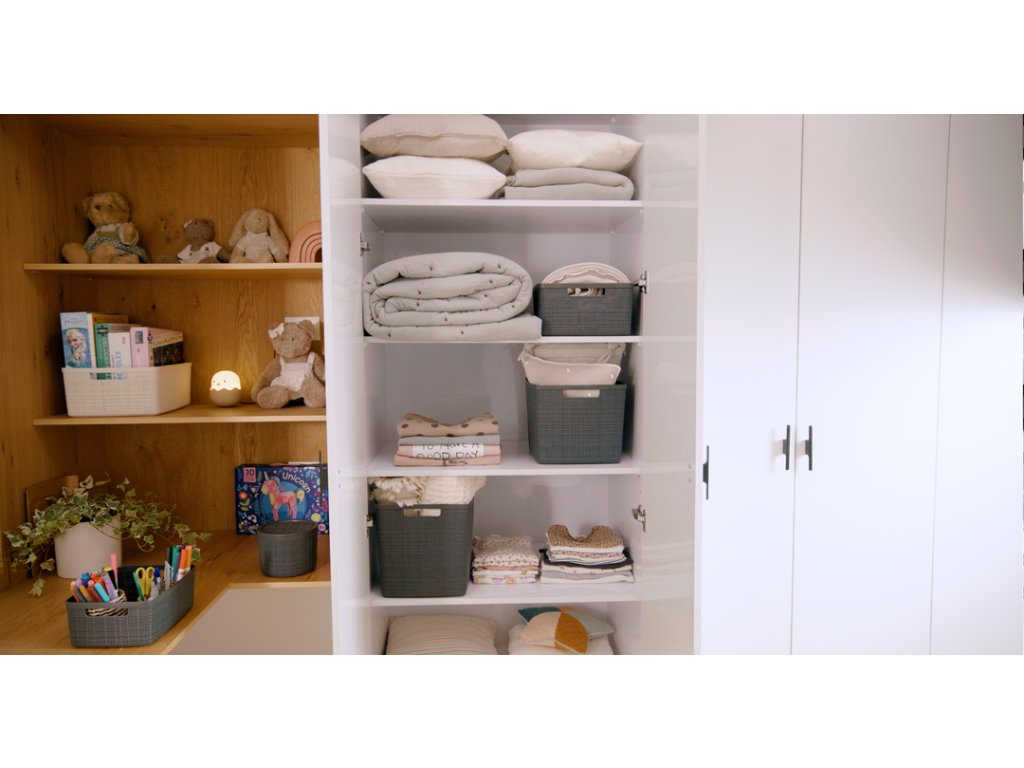 Tento stylový a praktický box se vyrábí ze 100% recyklovaného plastu. Je tedy šetrnější k životnímu prostředí. Jeho provedení připomíná tkaninu a perfektně zapadne do každého prostředí. Doplní vybavení kuchyně, obývacího pokoje, ložnice a klidně i koupelny.
