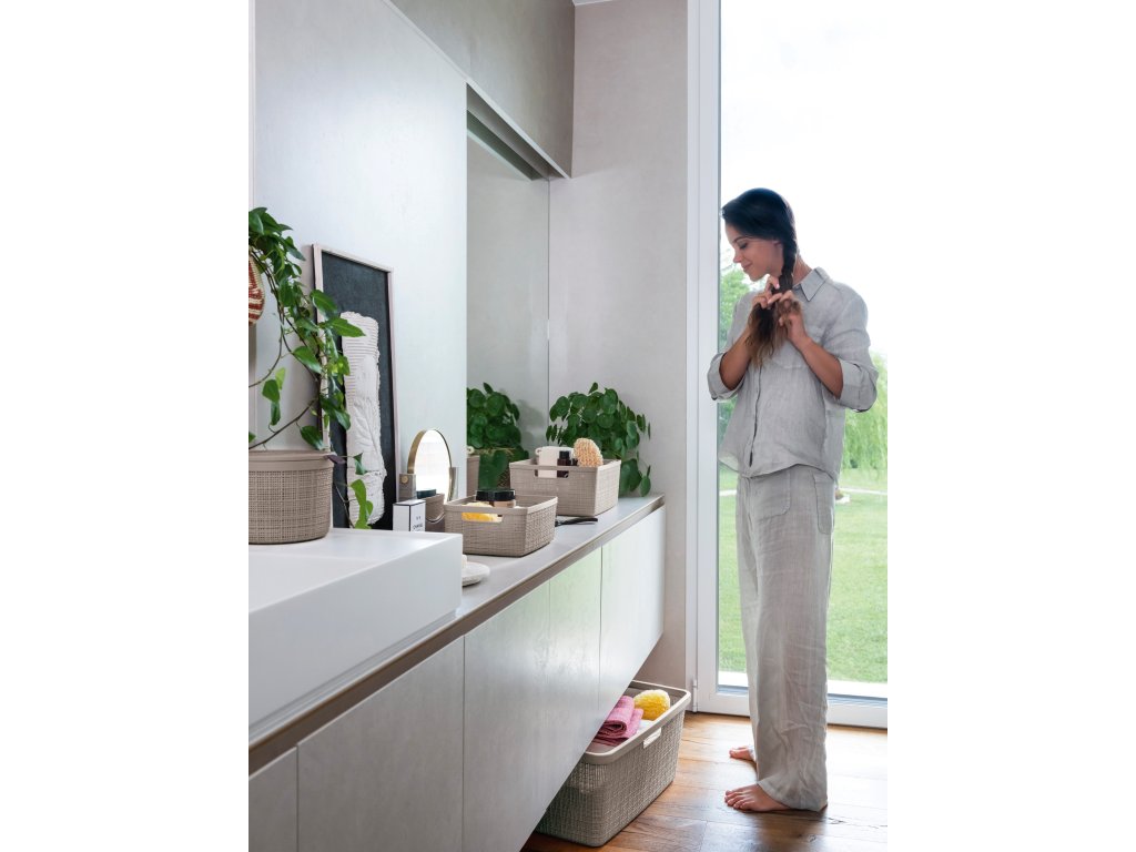 Tento stylový a praktický box se vyrábí ze 100% recyklovaného plastu. Je tedy šetrnější k životnímu prostředí. Jeho provedení připomíná tkaninu a perfektně zapadne do každého prostředí. Doplní vybavení kuchyně, obývacího pokoje, ložnice a klidně i koupelny.