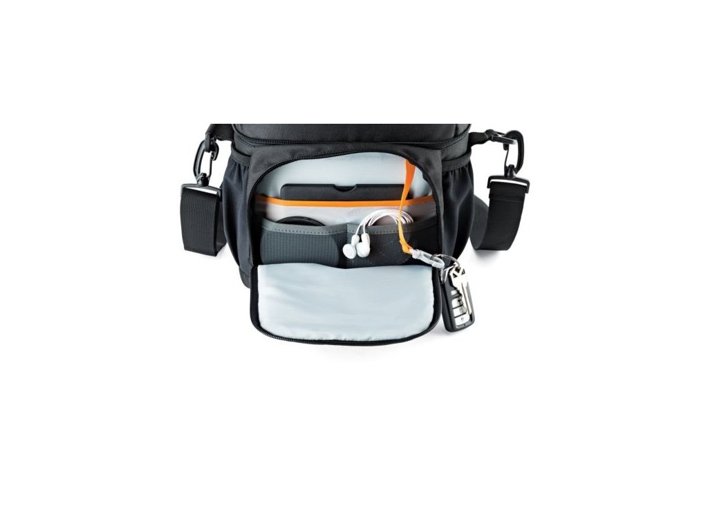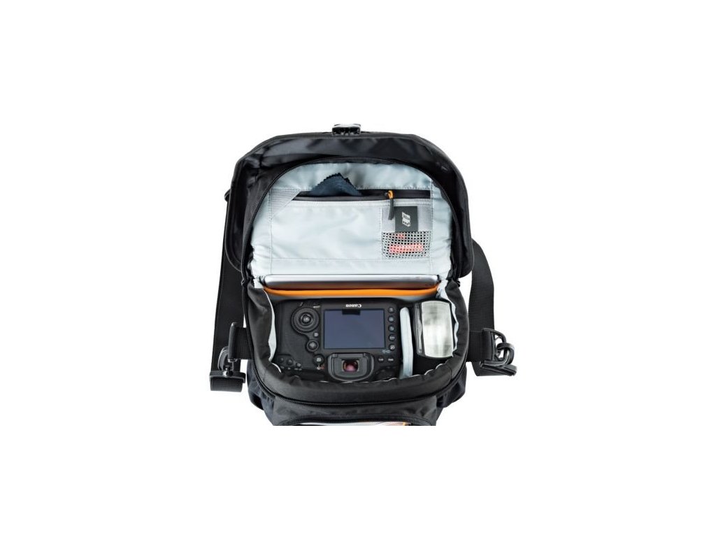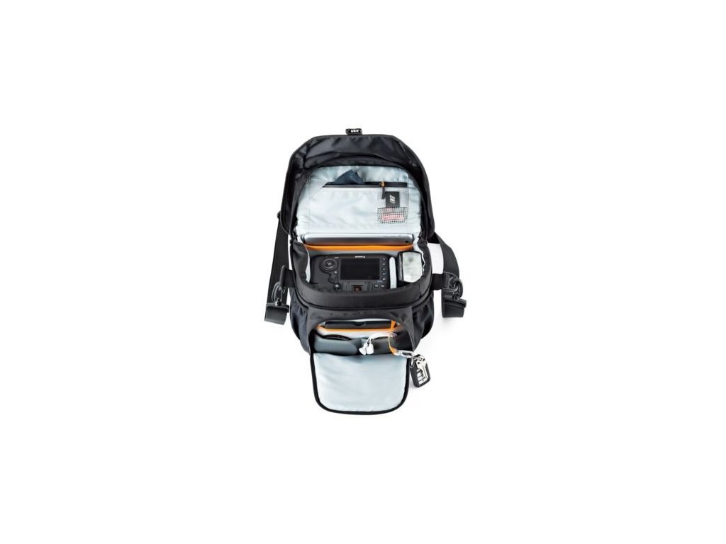 V hlavní komoře je umístěna samostatná kapsa, do které pohodlně vložíte smartphone nebo tablet. Na vnitřní straně víka hlavní komory naleznete praktickou transparentní kapsičku na paměťové karty a kapsu se zipem. Přední kapsa na zip je krytá víkem hlavní komory a má sofistikované vnitřní členění. Přední kapsa na vnější straně víka hlavní komory má voděodolný zip. Dvě vnější boční síťové kapsy a kapsu na zip na zadní straně můžete využít na příslušenství a osobní věci.
