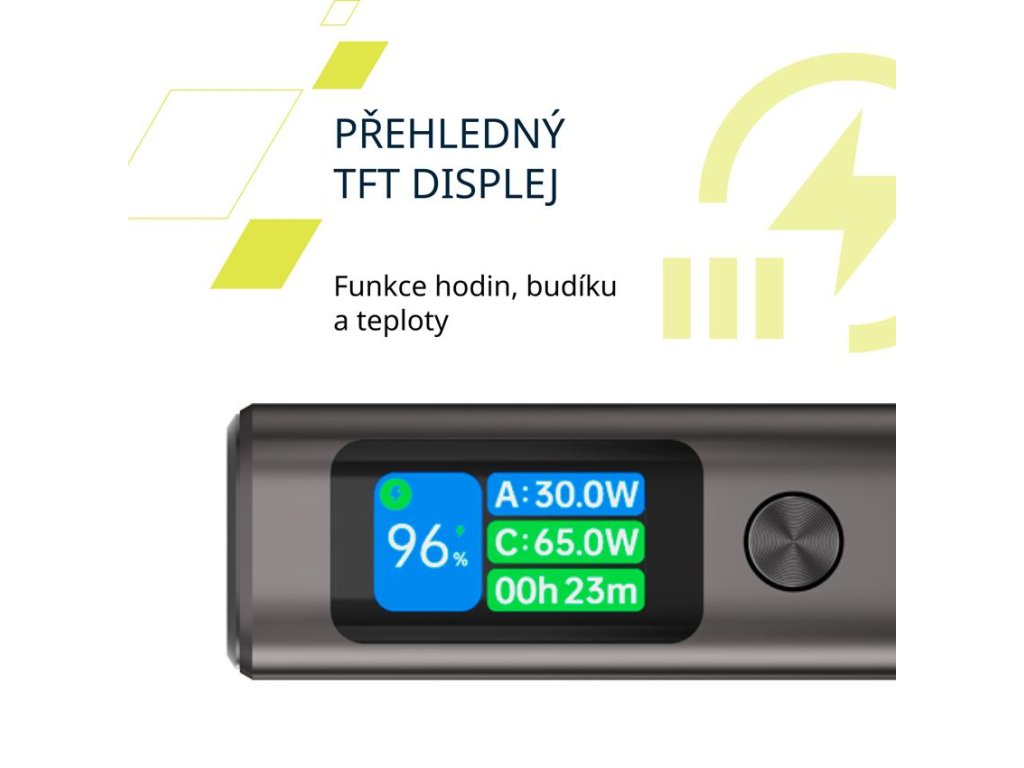 Inteligentní digitální TFT displej umožňuje snadno sledovat zbývající energii powerbanky, úroveň výstupu a stav nabíjení.