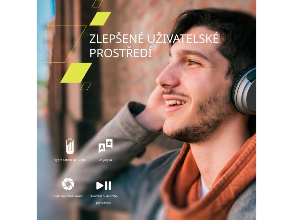 Přizpůsobitelný ciferník, působivá výdrž baterie 5 až 7 dní, dálkové ovládání fotoaparátu a přehrávání médií. Na výběr je 25 jazyků.