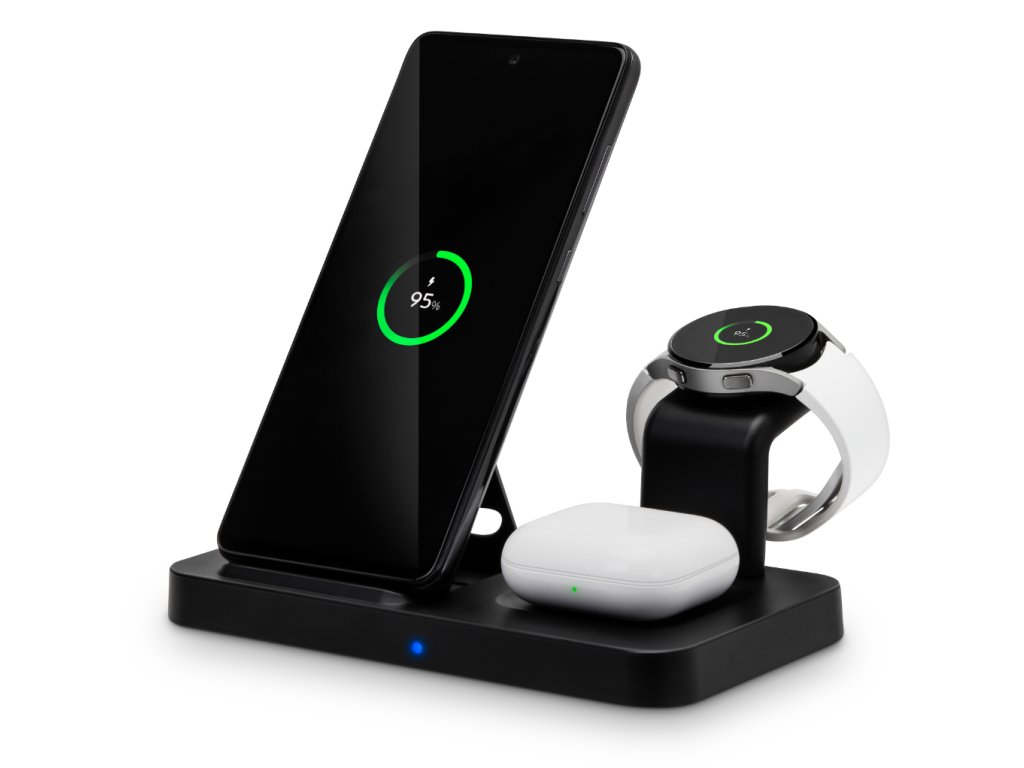 MultiCharge 3v1 Wireless Fast Charge bezdrátová magnetická Qi nabíječka. Podporuje až 15W Qi rychlonabíjení mobilních telefonů, 2.5W Qi nabíjení pro hodinky Samsung a 3W Qi nabíjení pro sluchátka.