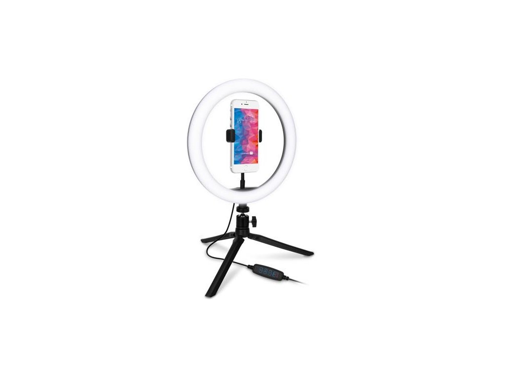 Kruhové selfie LED světlo "Selfie10Ring" s flexibilním držákem na mobilní telefon a stativem s kulovou hlavou pro domácí i profesionální použití umožňuje nastavit barevnou teplotu světla na 3 různé úrovně (3000/4500/6500 K). Součástí výbavy je dálkový ovladač na kabelu.