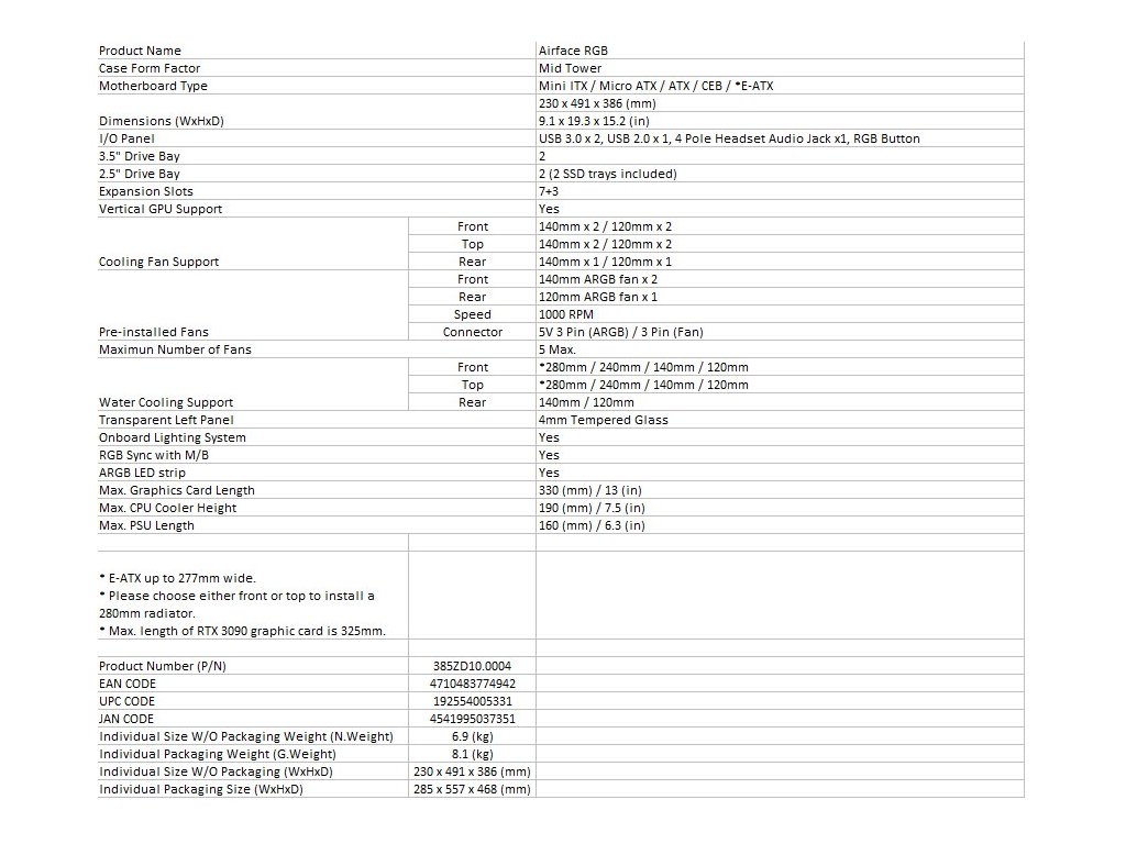 Airface RGB’s 230mm wide-body design allows much larger interior space with better cooling performance and cable management. It can surely fit an E-ATX motherboard, a 330mm graphic card, two 3.5” HDDs and two 2.5” SSDs, which allows for the most extreme system builds.