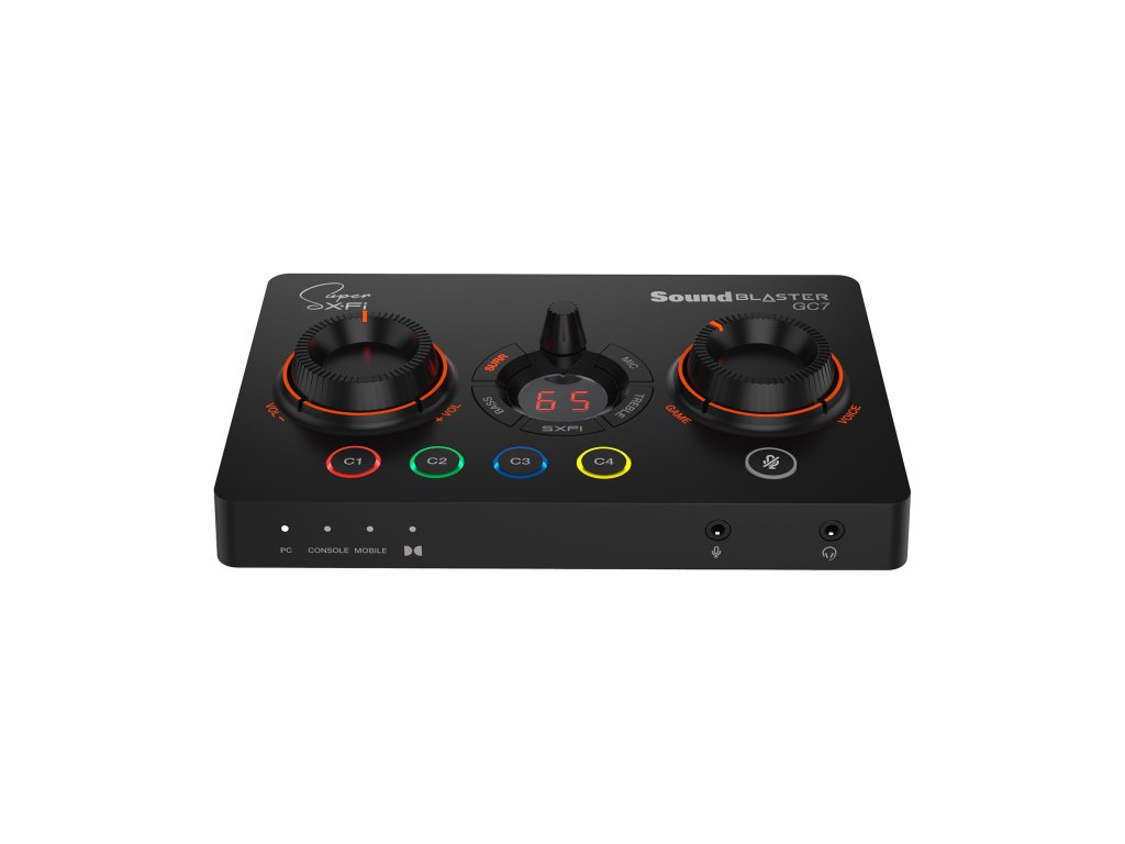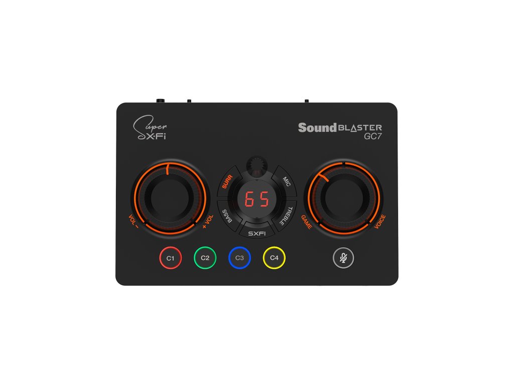 Game Streaming USB DAC a Amp se Super X-Fi® a programovatelnými tlačítky Sound Blaster GC7 má na těle čtyři programovatelná tlačítka pro rychlý přístup k uloženým předvolbám. Přizpůsobte si každé tlačítko, jak uznáte za vhodné – ať už jde o spuštění aplikace třetí strany nebo zapnutí sady konkrétních nastavení streamování pomocí zkratek – vše máte na dosah ruky. A když už jste u toho, přizpůsobte si RGB osvětlení každého tlačítka tak, aby odpovídalo zbytku vašeho nastavení, a hrajte pohodlně ve tmě s podsvícenými LED diodami.