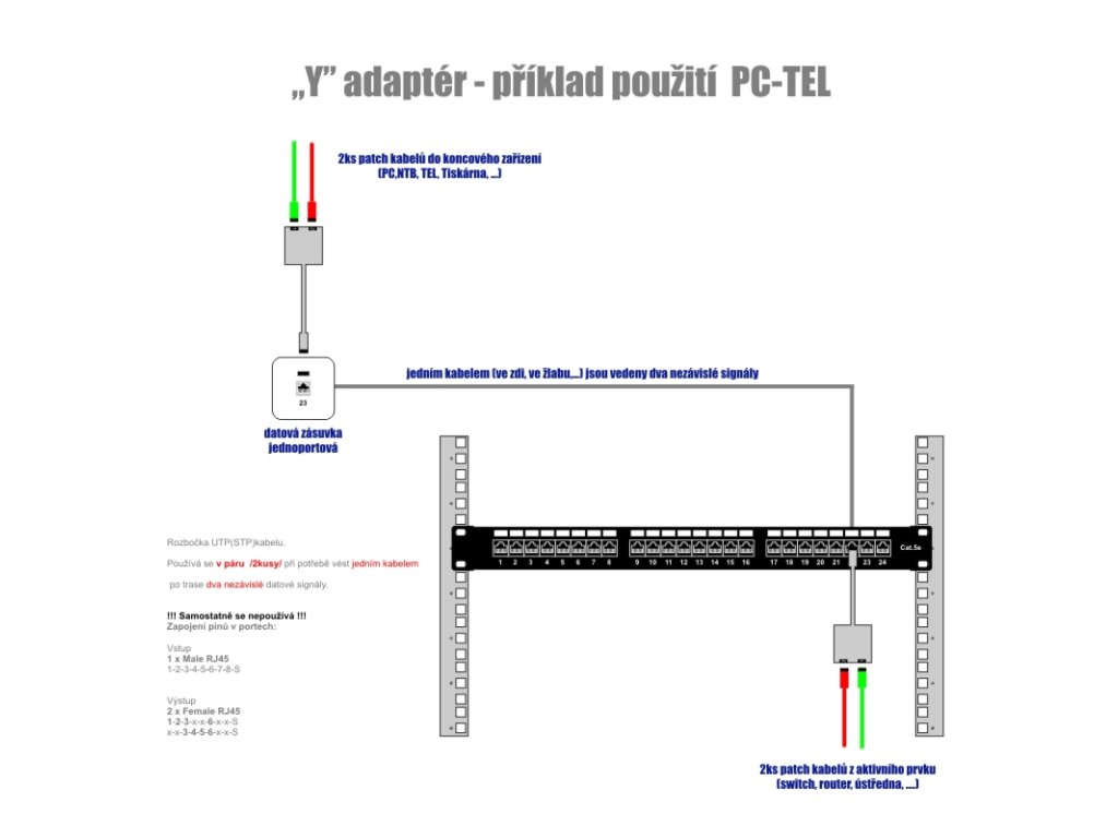 Stíněná rozbočka STP(také UTP) kabelu. Foto ilustrační (balení obsahuje 1ks) Používá se v páru při potřebě vést jedním kabelem datový signál + signál telefonní.