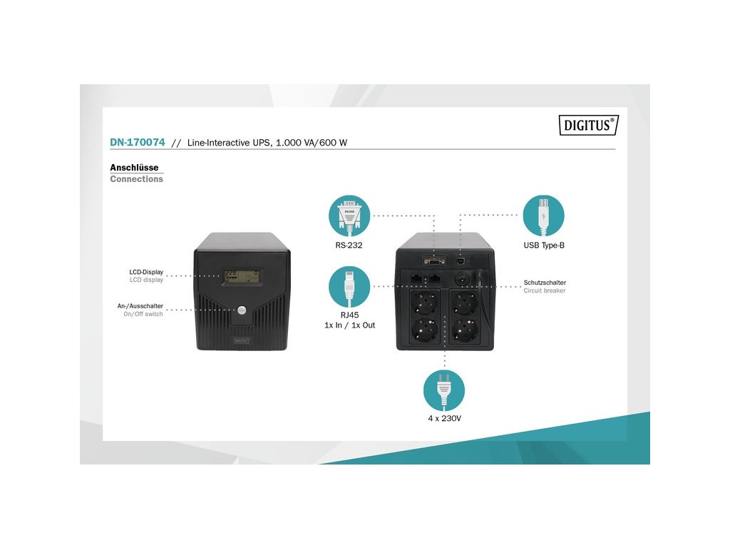 DIGITUS Professional Line-Interactive UPS, 1000VA / 600W 12V / 7Ah x2 baterie, 4x CEE 7/7, AVR, USB, RS232, RJ11 / RJ45, LCD displ