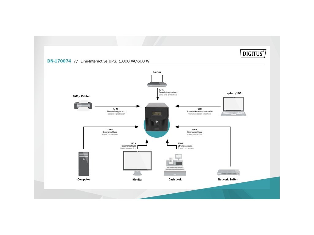 DIGITUS® UPS Line-Interactive přichází s kompaktní velikostí a vynikajícím mikroprocesorovým ovládáním, které zaručuje vysokou spolehlivost. Díky uživatelsky přívětivému provozu poskytují vysoce výkonnou ochranu vašich obchodních a kancelářských počítačových systémů před ztrátou a poškozením dat. Funkce jako ochrana proti přetížení, vybití a přebití, funkce studeného startu a funkce úspory energie, jakož i akustický poplašný systém jsou jen některé výhody jednotek UPS DIGITUS® Line-Interactive.