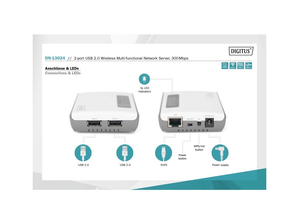 DIGITUS 2portový bezdrátový multifunkční síťový server USB 2.0, 300 Mb / s