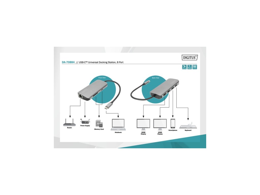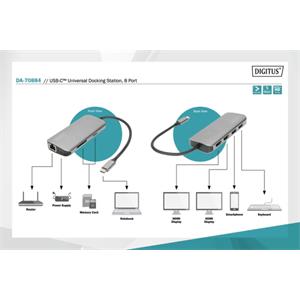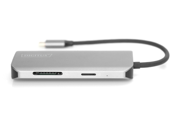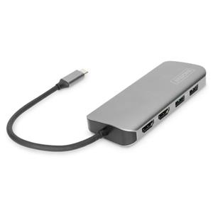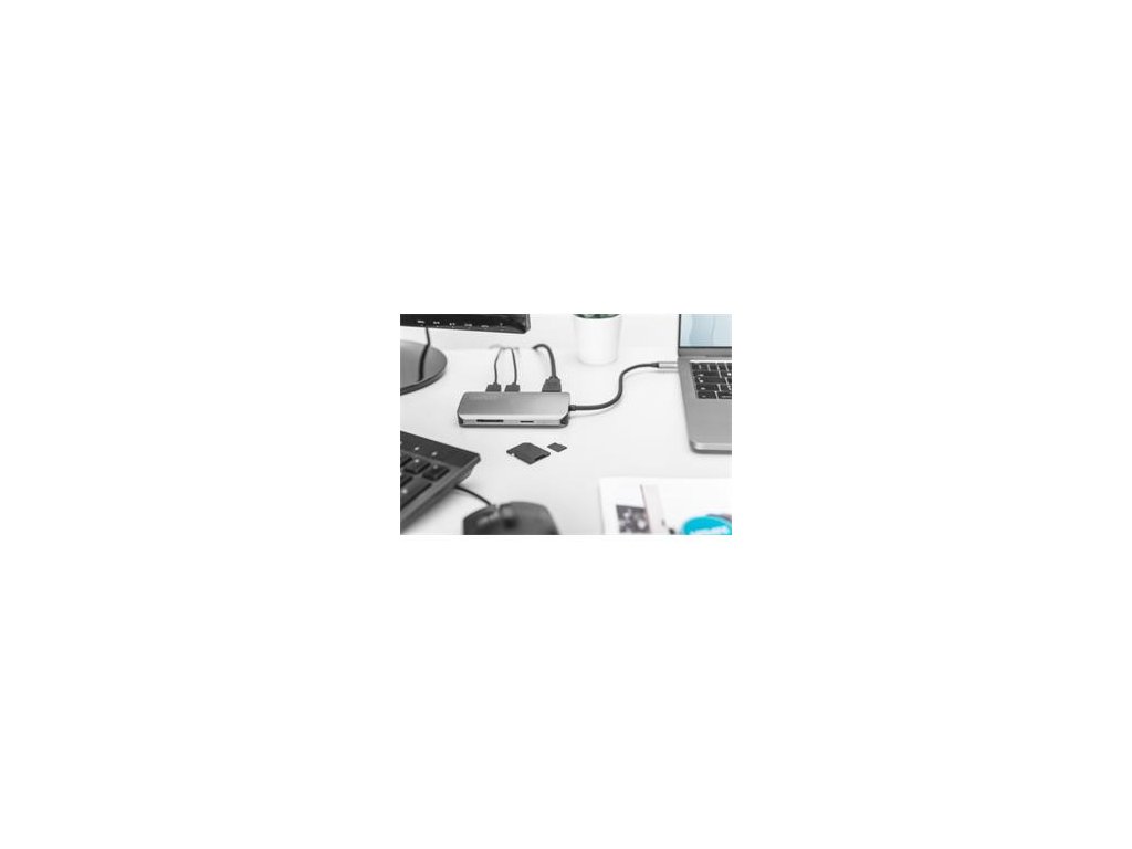 Digitus 8portová dokovací stanice USB-C, 2xUSB3.0, 1xRJ45, 2xHDMI, 1xPD, 1xMicro SD, 1xSD, šedá