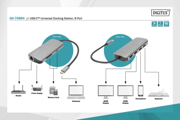 Dokovací stanice DIGITUS® USB-C ™ rozšiřuje váš notebook o 8 dalších rozhraní. Kromě jiného jsou integrována 2 rozhraní HDMI® s rozlišením až 4K / 30 Hz. Při současném připojení 2 monitorů je podporováno rozlišení Full HD 1080P / 60 Hz. Dokud je dokovací stanice používána, můžete nabíjet připojený notebook prostřednictvím stávajícího napájecího portu USB-C ™. Maximální nabíjecí kapacita je 100 W. Zahrnují se také 2 x připojení USB 3.0, ke kterým lze připojit periferní zařízení, jako je klávesnice, myš nebo externí pevný disk / USB flash disk. Nabíjení baterií (BC 1.2) nabízí také možnost nabíjení zařízení, jako jsou smartphony nebo tablety. Existující připojení Gigabit RJ45 můžete propojit se svým routerem a tedy s internetem. To vám umožní přístup k připojenému notebooku. Dokovací stanici doplňují dva sloty pro karty SD a Micro SC. Podporovány jsou paměťové karty až 2 TB. Kompaktní pouzdro s leštěným hliníkovým povrchem se může pochlubit stylovým a elegantním vzhledem a je snadno přenosné. Díky Plug and Play není nutná instalace ovladače. Tímto způsobem lze dokovací stanici také rychle připojit k externím systémům.