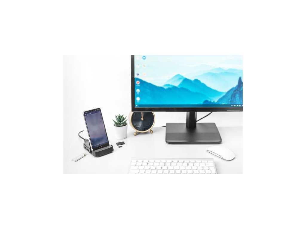 Používáte svůj smartphone jako stolní systém? To není problém s dokovací stanicí smartphonu od společnosti DIGITUS®. Obsah smartphonu si můžete nejen vychutnat na připojeném displeji v brilantní kvalitě UHD, ale ve stolním režimu můžete svůj smartphone používat stejně jako běžný počítačový systém. S připojenou klávesnicí a myší je dokovací stanice téměř stejná jako standardní počítač. Ideální pro cestování, když nemáte k dispozici notebook ani pro domácí použití, například pro zobrazení videí, fotografií z dovolené nebo jiných dokumentů přímo na velké obrazovce. K rozhraní HDMI lze připojit displeje s rozlišením UHD do 4K @ 30 Hz. K dispozici jsou také dvě rozhraní USB 2.0, např. pro klávesnici a myš, stejně jako port USB 3.0 pro další zařízení s vyšší přenosovou rychlostí, např. pevné disky nebo USB disky. Integrované čtečky karet pro paměťové karty SD a microSD umožňují organizovat vaše média a soubory. Dělá téměř vše, co byste mohli potřebovat. Proměňte svůj smartphone na stolní systém pomocí 7portové dokovací stanice od společnosti DIGITUS®.