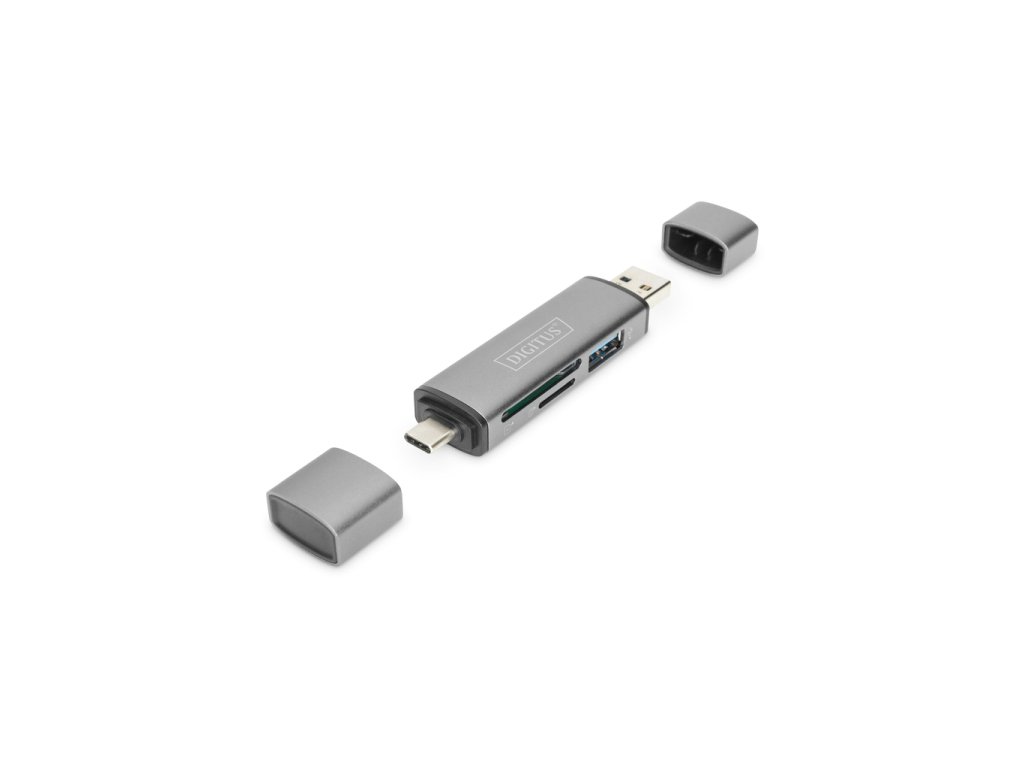Digitus dvojitá čtečka karet OTG (USB-C + USB 3.0) 1x SD, 1x MicroSD, 1x USB 3.0, šedá