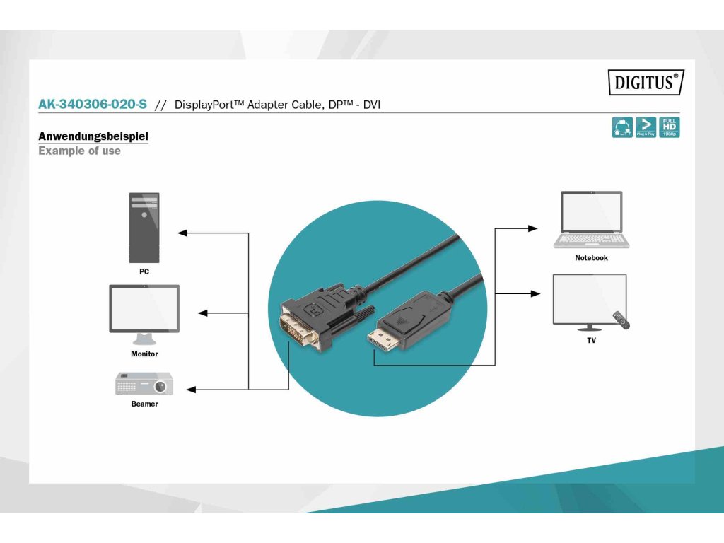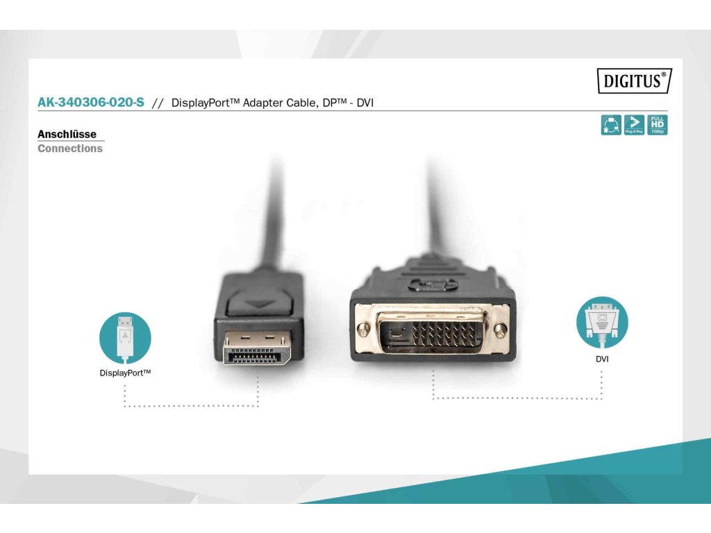 Tento digitální HD kabel převádí signály DisplayPort na signály DVI a je ideální pro připojení zařízení DisplayPort k televizoru HD, projektoru nebo monitoru s rozhraním DVI.