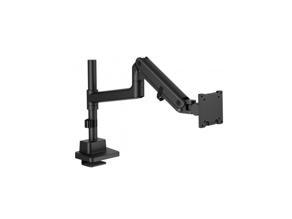 Držák na jeden monitor - Plně mobilní, odolný, prostorově úsporný Plně mobilní držák stolu pro jednotlivé monitory zaujme svou robustní robustní konstrukcí a spolehlivě podporuje ploché nebo zakřivené obrazovky až do velikosti 57 palců a hmotnosti až 27 kg. Integrovaný systém plynových pružin s nastavitelným mechanismem napnutí pružiny umožňuje snadné a přesné umístění monitoru - podle individuálních požadavků. Díky velkému rozsahu pohybu umožňuje držák monitor naklánět, otáčet, otáčet a plynule výškově nastavovat, což zajišťuje ergonomickou práci a optimální pohodlí při sledování. Funkce rychlého uvolnění VESA umožňuje rychlou montáž nebo demontáž obrazovky bez použití nástrojů, zatímco rychlospojka zajišťuje rychlou instalaci ramen. Držák je zcela namontován nahoře na stole a nabízí dvě flexibilní možnosti montáže - jak pomocí stolní svorky, tak průchodky. Díky integrovanému vedení kabelů zůstává pracoviště vždy uspořádané. Přídavný držák na tyč rozšiřuje možnosti nastavení a završuje funkční design.