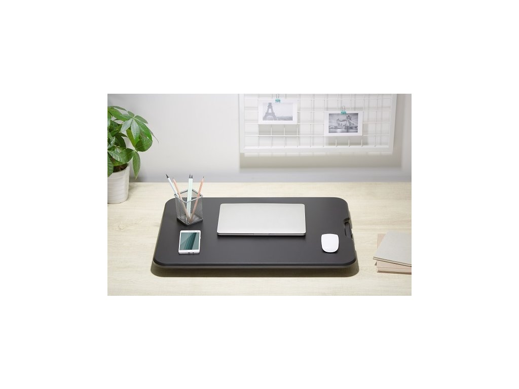 Ergonomický nástavec pro práci ve stoje/sedu nabízí 6 nastavení výšky pomocí integrované spirálové pružiny, kterou lze zaaretovat. Díky vysoce kompaktnímu designu jej lze rychle a snadno uložit, když se nepoužívá. Protiskluzové gumové podložky chrání povrch stolu a nabízejí bezpečné držení. Maximální nosnost je 8 kg. Pracovní plocha nabízí šířku 67 cm a hloubku 47 cm.
