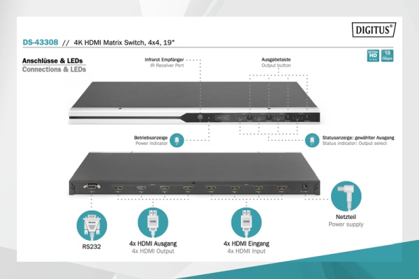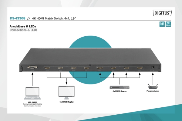 S přepínačem 4x4 HDMI® Matrix Switch od DIGITUS® si můžete vybrat mezi 4 zdroji signálu HDMI® a výstupními signály na 4 různé výstupy HDMI® nezávisle nebo současně. Všechny vstupy lze podle potřeby přiřadit různým výstupům nebo všem výstupům. Pohodlné ovládání pomocí dálkového ovládání, na zařízení nebo pomocí rozhraní RS232. Podporována je také šířka pásma 18 Gb / s pro plynulou reprodukci obsahu ve vysokém rozlišení 4K i Full 3D. Díky 19 "montážním konzolám, které jsou součástí dodávky, lze tento maticový přepínač instalovat do 19" stojanů, serverových skříní nebo nástěnných skříněk.