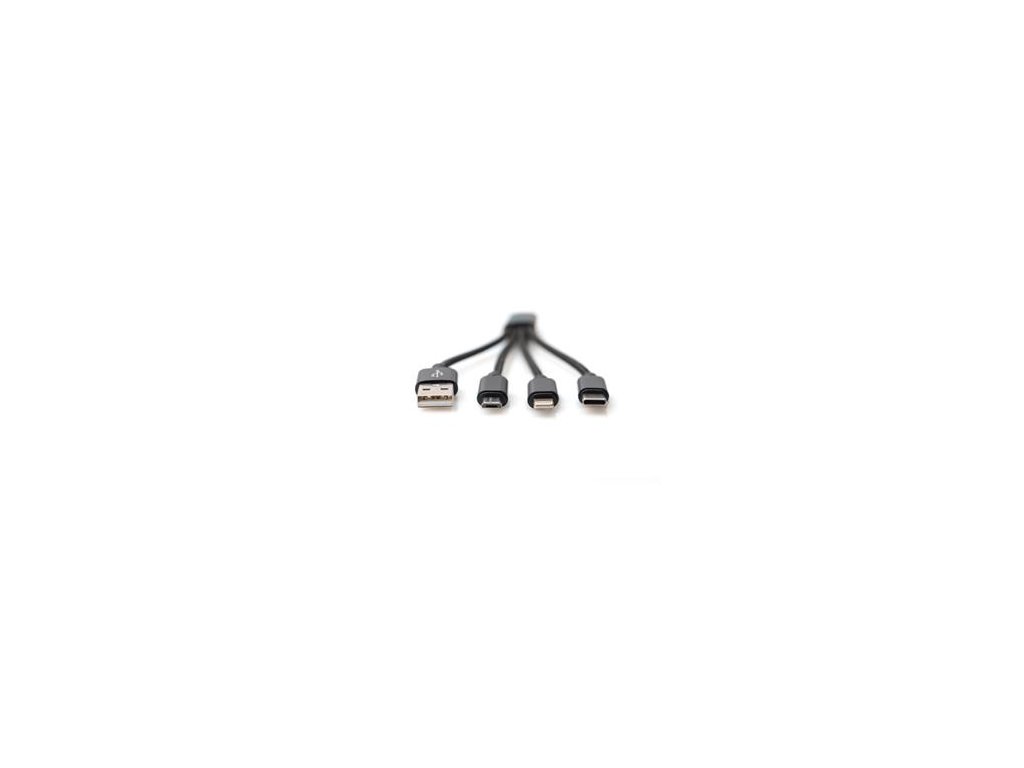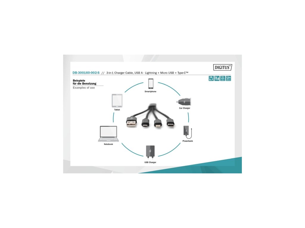 Nabíjecí kabel DIGITUS® 3 v 1 je ideální pro nabíjení vašich přenosných zařízení s konektory USB-C ™, Apple Lightning nebo Micro-B k napájecímu adaptéru, PC nebo jinému zařízení s USB A portem. Nabijte všechna svá zařízení pomocí jediného kabelu. Díky svým kompaktním rozměrům je tento kabel ideálním společníkem pro domácnost, kancelář nebo cestování.