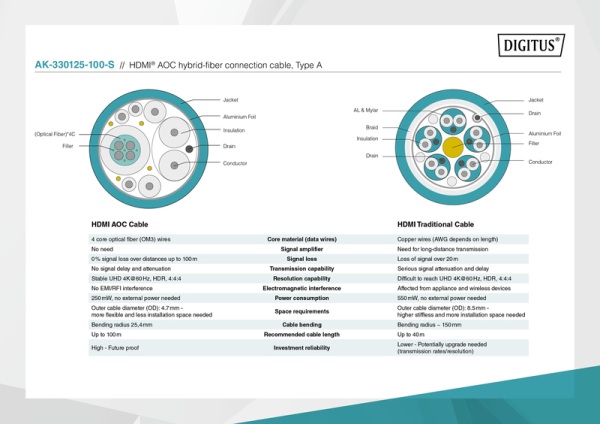 Aktivní kabel HDMI s technologií AOC je založen na hybridní konstrukci s měděným a optickým kabelem, která umožňuje šířku pásma až 18 Gbit / s s plným spektrem signálu HDMI