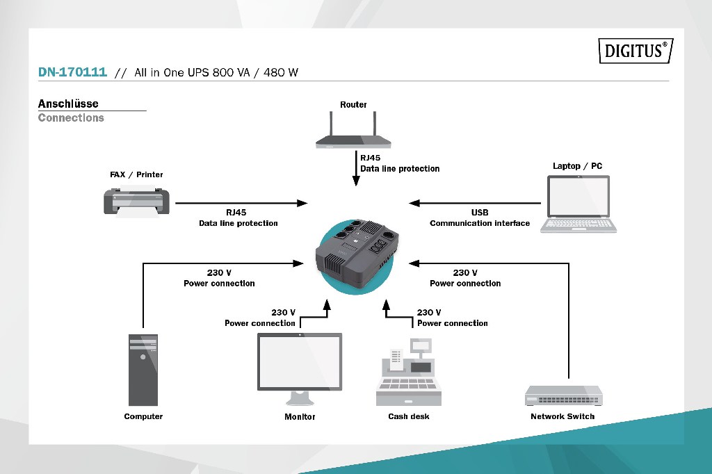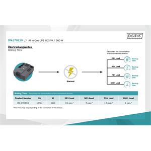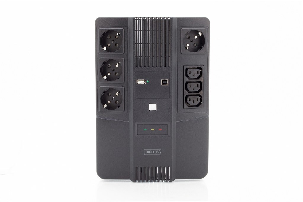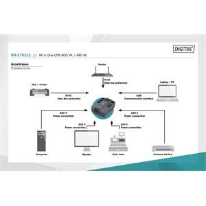 DIGITUS UPS vše-v-jednom, 800VA / 480W, LED 12V / 9Ah x1, 4x CEE 7 / 7,3x IEC C13, USB, RJ45