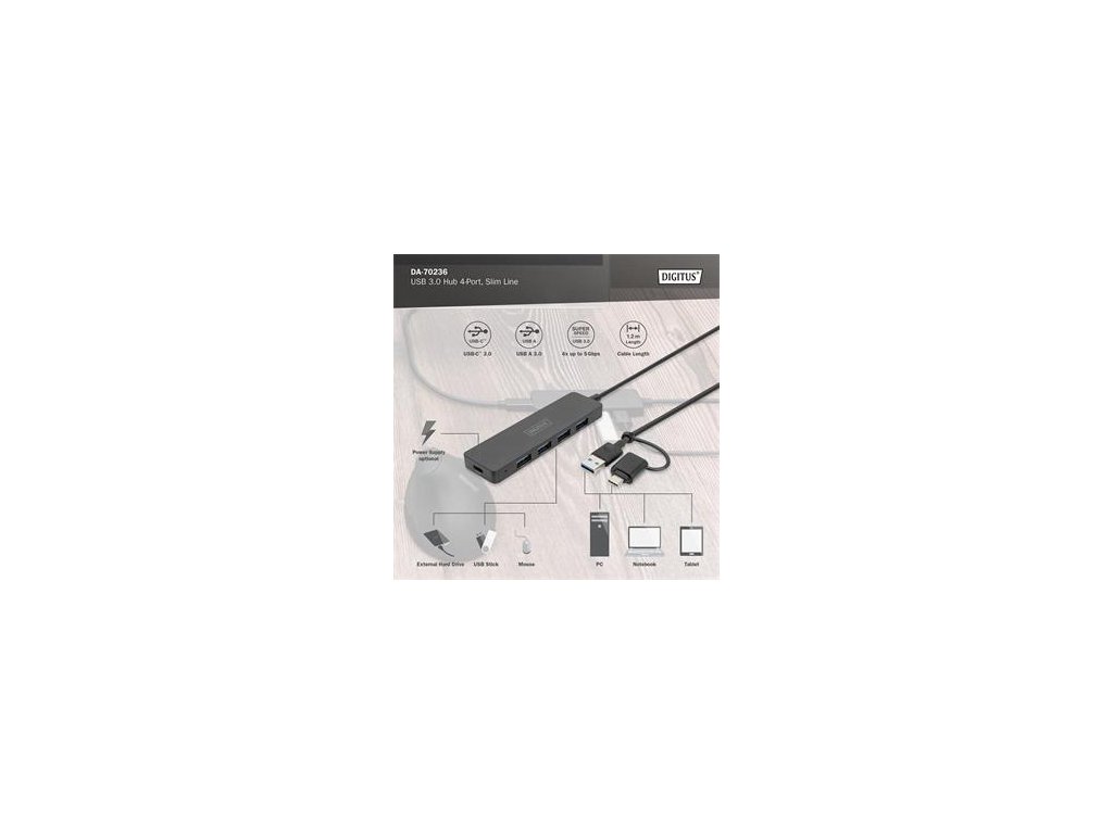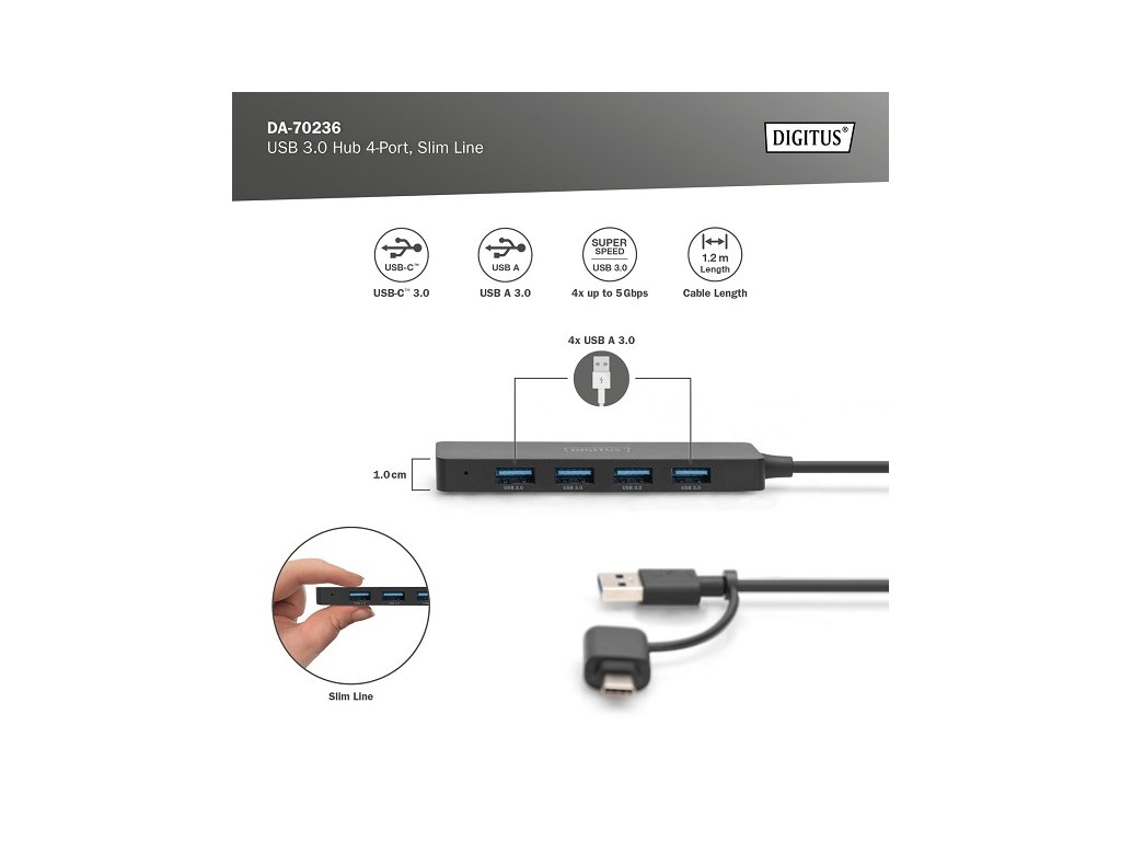 Rozbočovač DIGITUS USB 3.0 Hub Slim Line je ideálním rozšířením pro každé pracoviště. Až čtyři zařízení USB lze připojit a používat současně, což usnadňuje použití více vstupních zařízení nebo přenosných úložných zařízení. Díky technologii USB 3.0 dosahují datové přenosy rychlosti až 5 Gbps a zajišťují nejrychlejší výměnu dat. Díky tenkému designu je 4portový hub ideálním společníkem na cestách, ale je také nepostradatelný v domácnosti a kanceláři. Pomocí 1,2m kabelu můžete upravit délku tak, aby dokonale odpovídala vašemu notebooku nebo pracovní stanici.